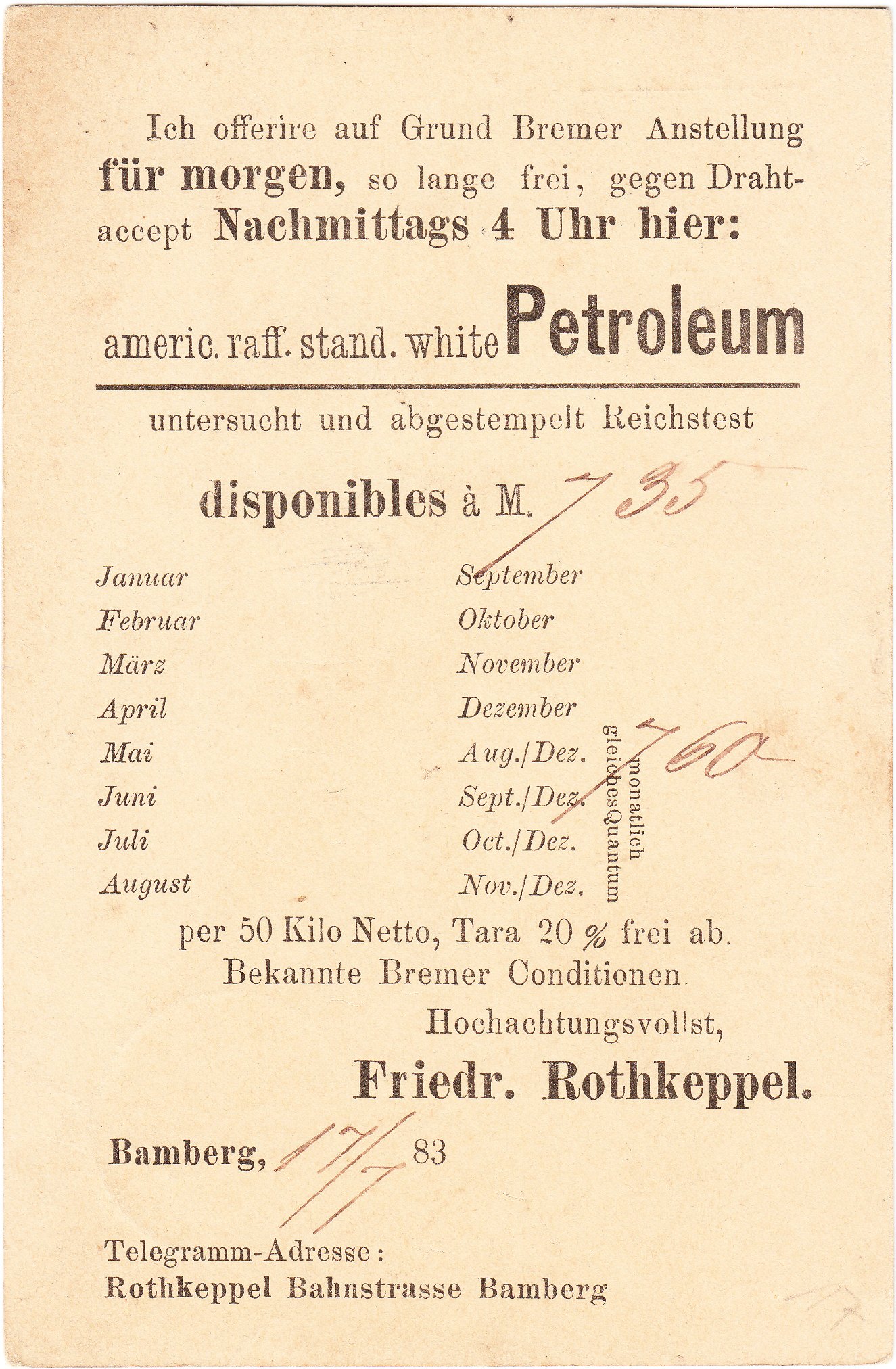 Diese am 17.07.1883 gebrauchte Ganzsache aus Bayern trägt auf der Rückseite einen privaten Zudruck der Firma Friedrich Rothkeppel in Bamberg, mit dem "americ. raff. stand. white Petroleum" angeboten wird: