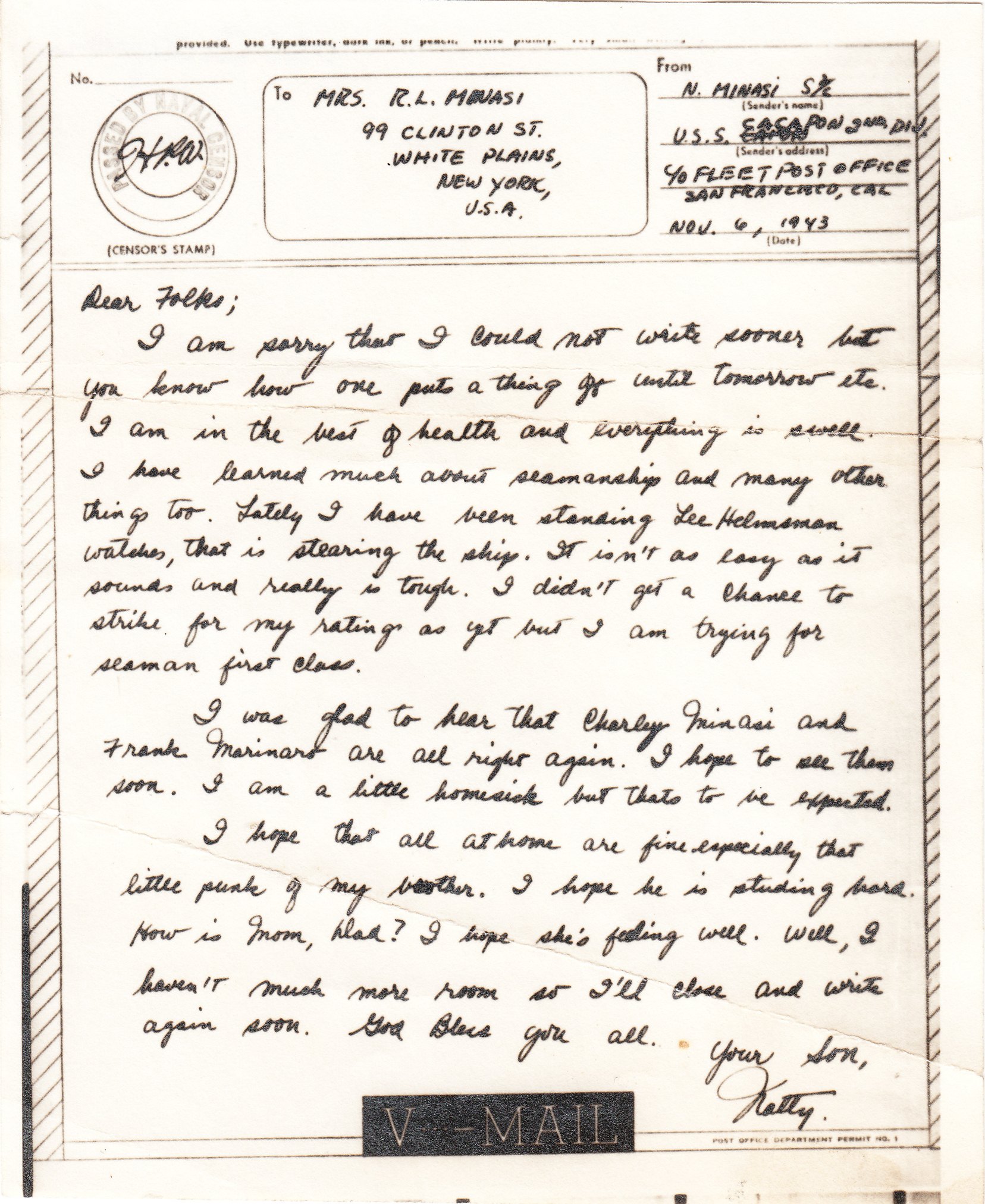 Auf diesem Tanker tat am 06.11.1943 Natale Minasi als "Seaman Second Class" = "S 2 c" Dienst, der diese V-Mail an seinen Vater Rocco Minasi in New York schrieb: