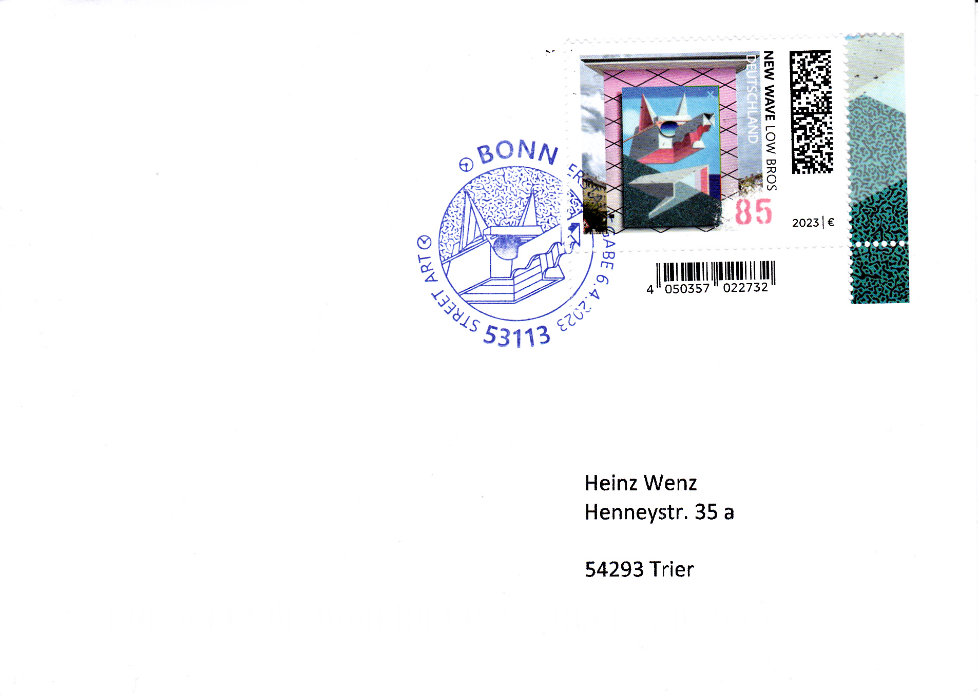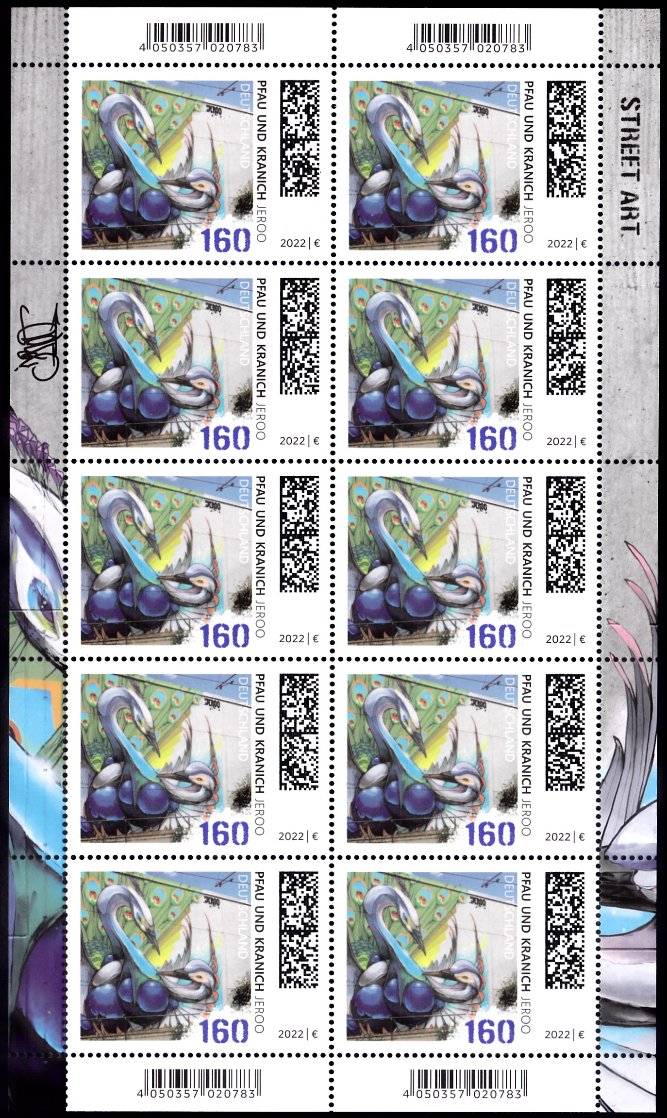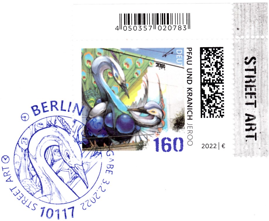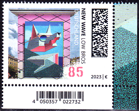 Auf einer Marke der Serie "Street Art" der Deutschen Post (MiNr 3758) wird uns die Wandmalerei "New Wave" der deutschen Graffiti-Künstler Christoph Schmidt (geb. 1984) und Florin Schmidt (geb1982), die unter dem alias "Low Bros" bekannt geworden sind, vorgestellt. Hier zeige ich eine Marke vom Eckrand mit EAN-Codierung.