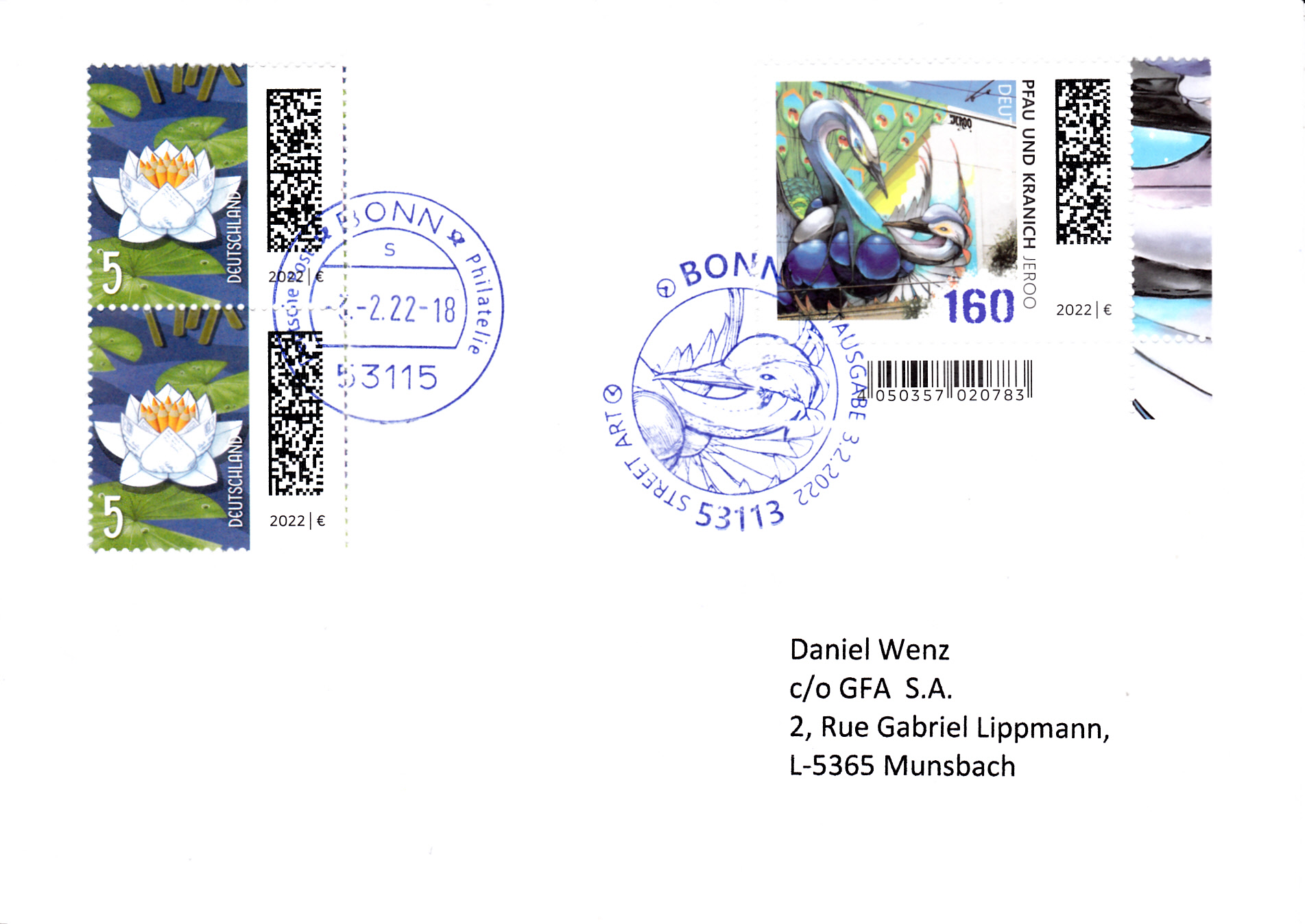 Brief nach Luxemburg mit dieser Marke und dem Ersttagsonderstempel aus Bonn. Die Zusatzfrankatur mit zwei Marken zu 5 Cent aus der Rolle mit dem EAN-Code Zwischenfeld wurde mit einem Tagesstempel Bonn entwertet.