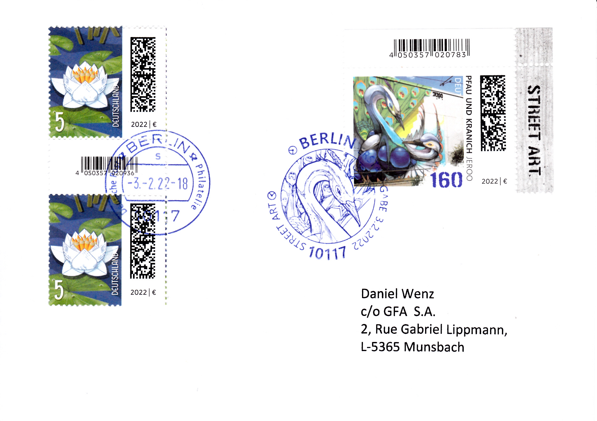 Auf einer Marke der Deutschen Post (MiNr 3783) wird die Wandmalerei "Past and Future" von Claudia Walde (*1980) alias "MadC" gezeigt.