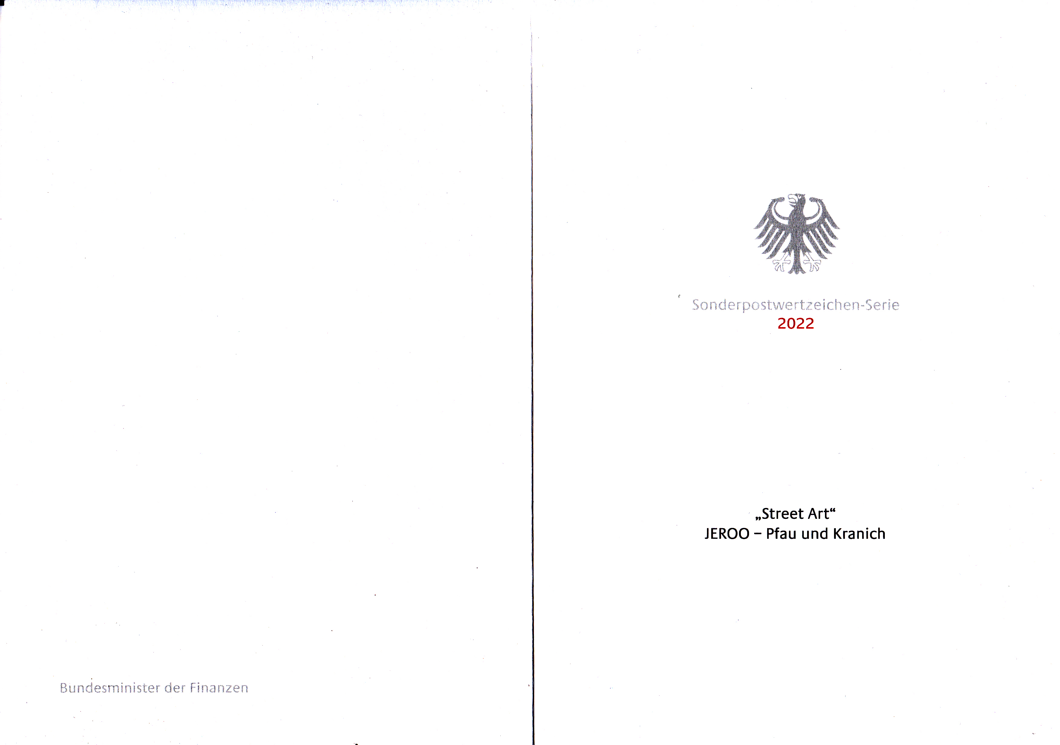 Ministerkarte des Bundesministers für Finanzen mit zwei Marken der Deutschen Post (MiNr 3667) der Serie "Street Art" mit dem Motiv "Wandmalerei „Pfau und Kranich“" von Christoph "Jeroo" Ganter (geb.1980, deutscher Graffiti-Künstler) und den beiden Ersttagsonderstempel Bonn und Berlin.
