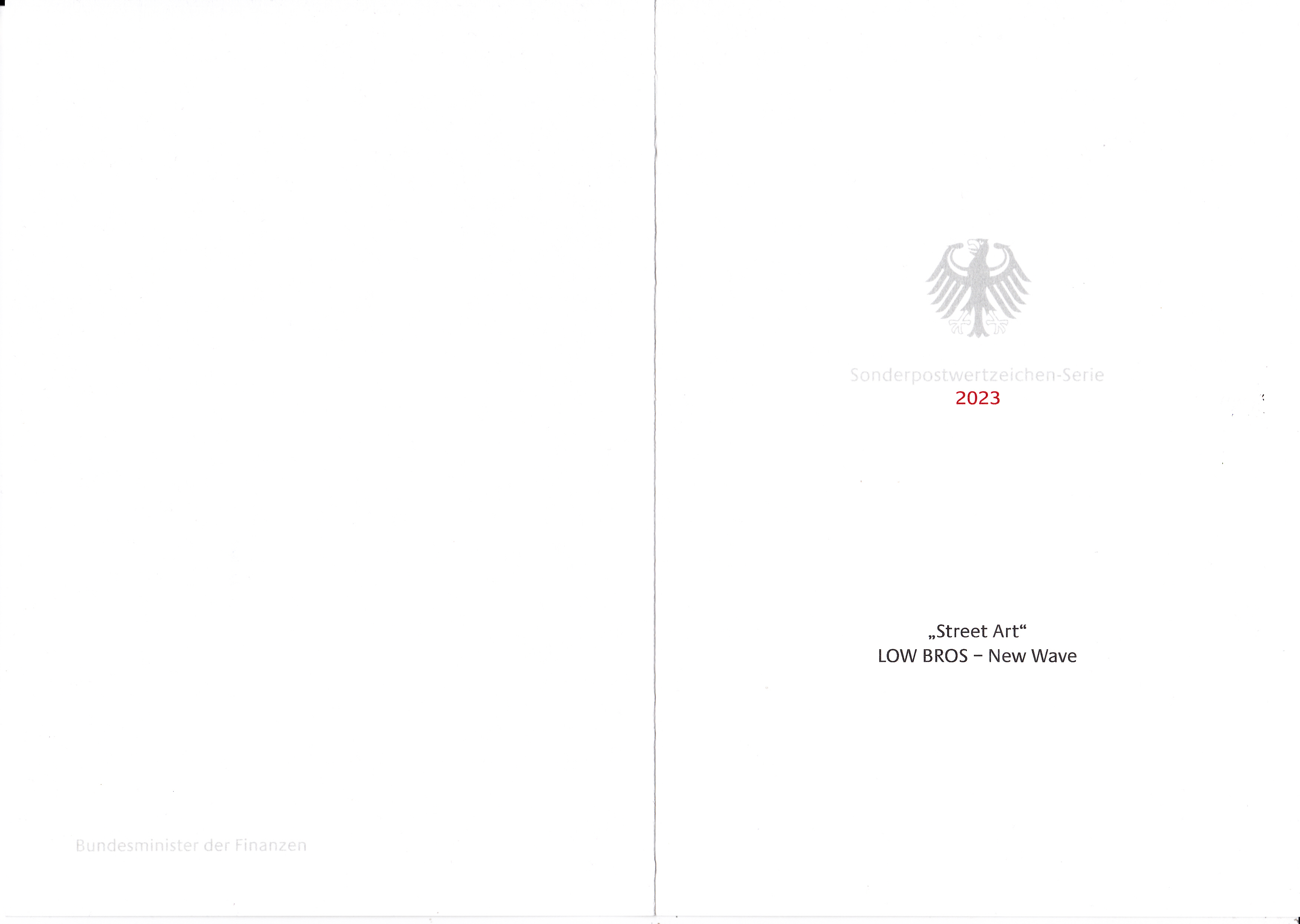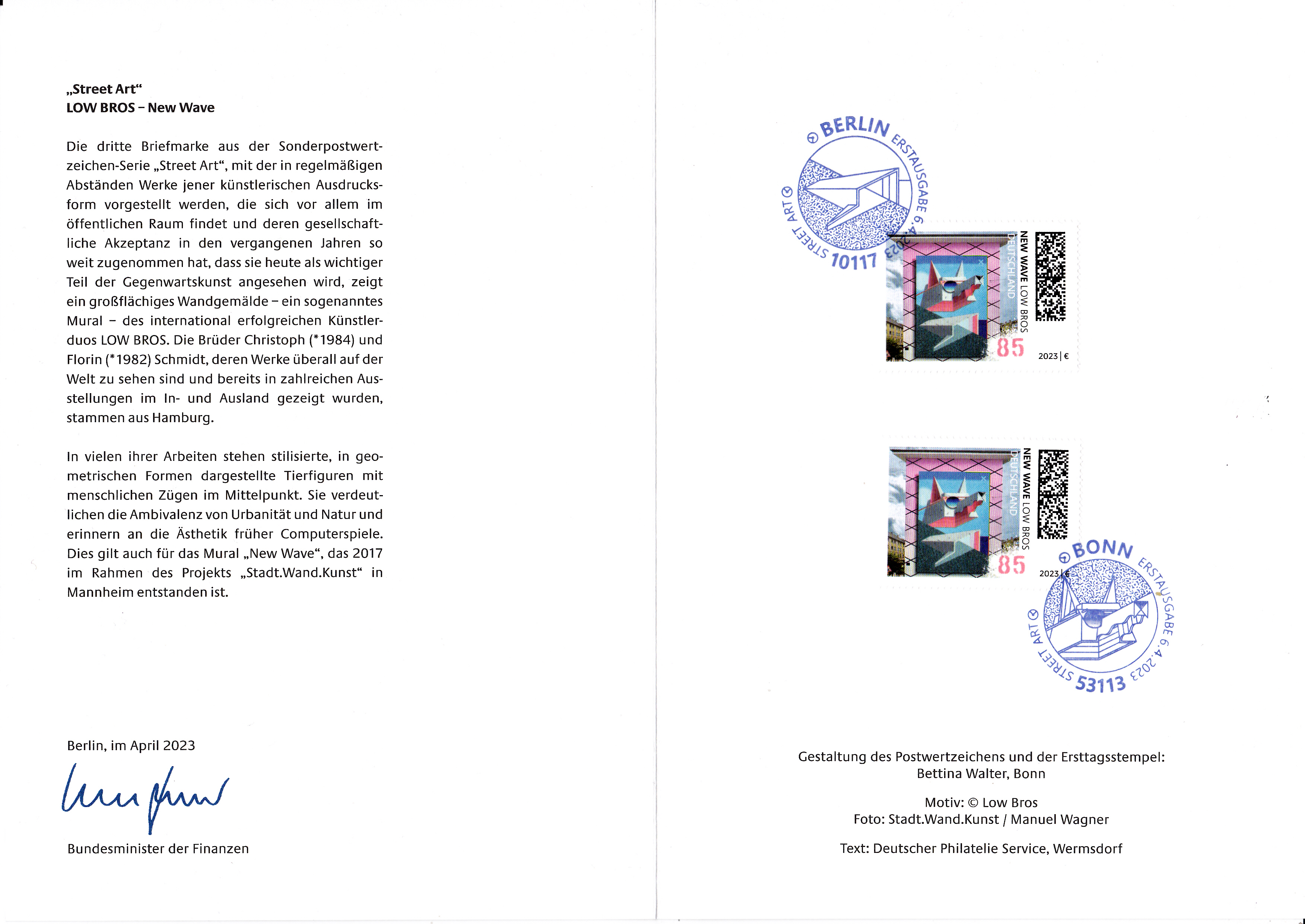 Ministerkarte des Bundesministers für Finanzen mit zwei Marken (MiNr 3758) mit der Wandmalerei "New Wave" von Christoph Schmidt (geb. 1984) und Florin Schmidt (geb.1982) alias "Low Bros", deutsche Graffiti-Künstler aus der Serie "Street Art" und den beiden Ersttagsonderstempel Bonn und Berlin.