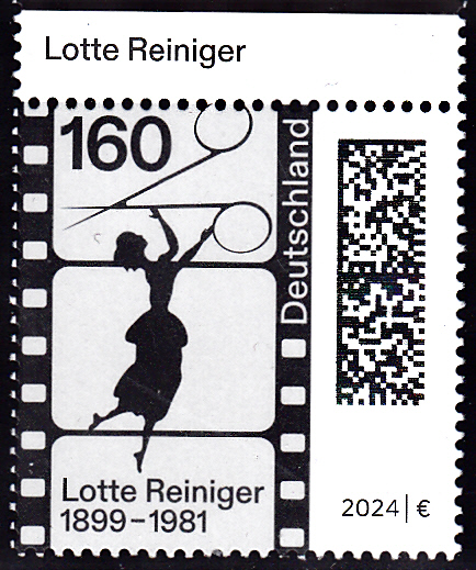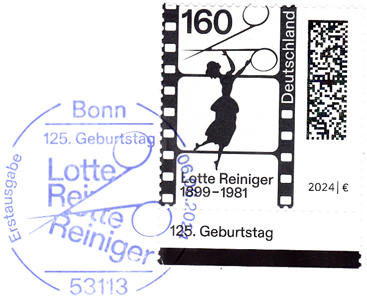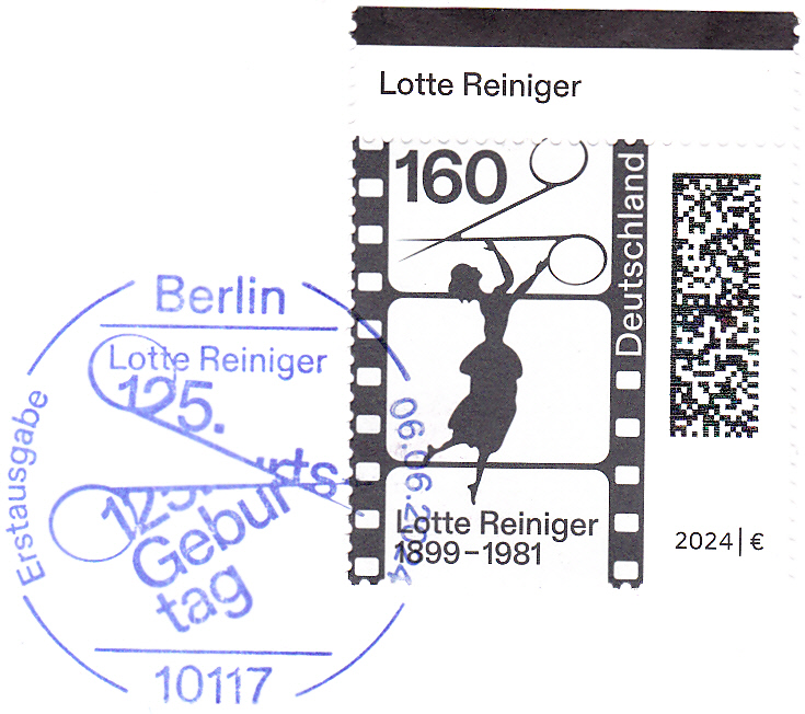 Zum 125. Geburtstag von Lotte Reiniger erschien bei der Deutschen Post diese Marke (MiNr 3834) mit einem Filmstreifen, einer Silhouettenschere und einer Scherenschnittfigur "Aschenputtel" von Lotte Reiniger.