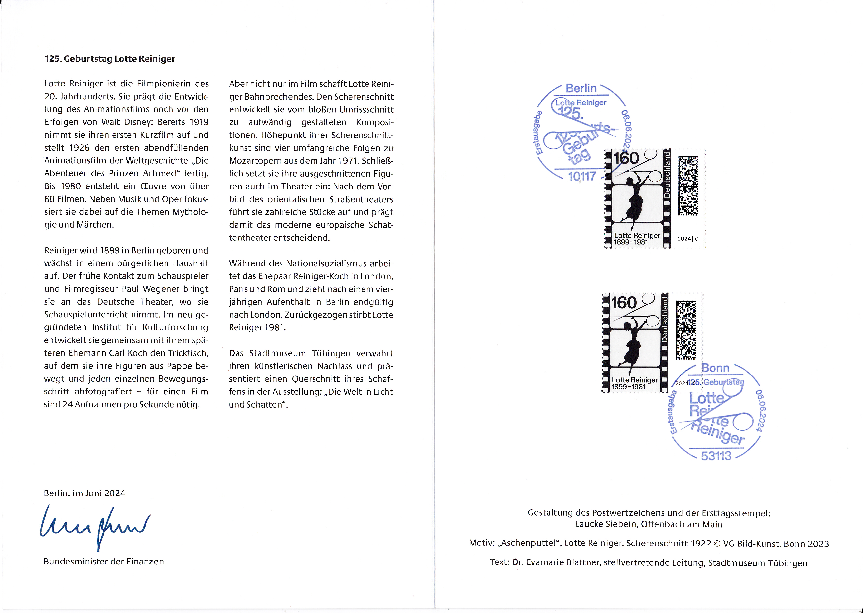 Ministerkarte des Bundesministers für Finanzen mit zwei Marken (MiNr 3834) zum 125. Geburtstag von Lotte Reiniger und den beiden Ersttagsonderstempel Bonn und Berlin.