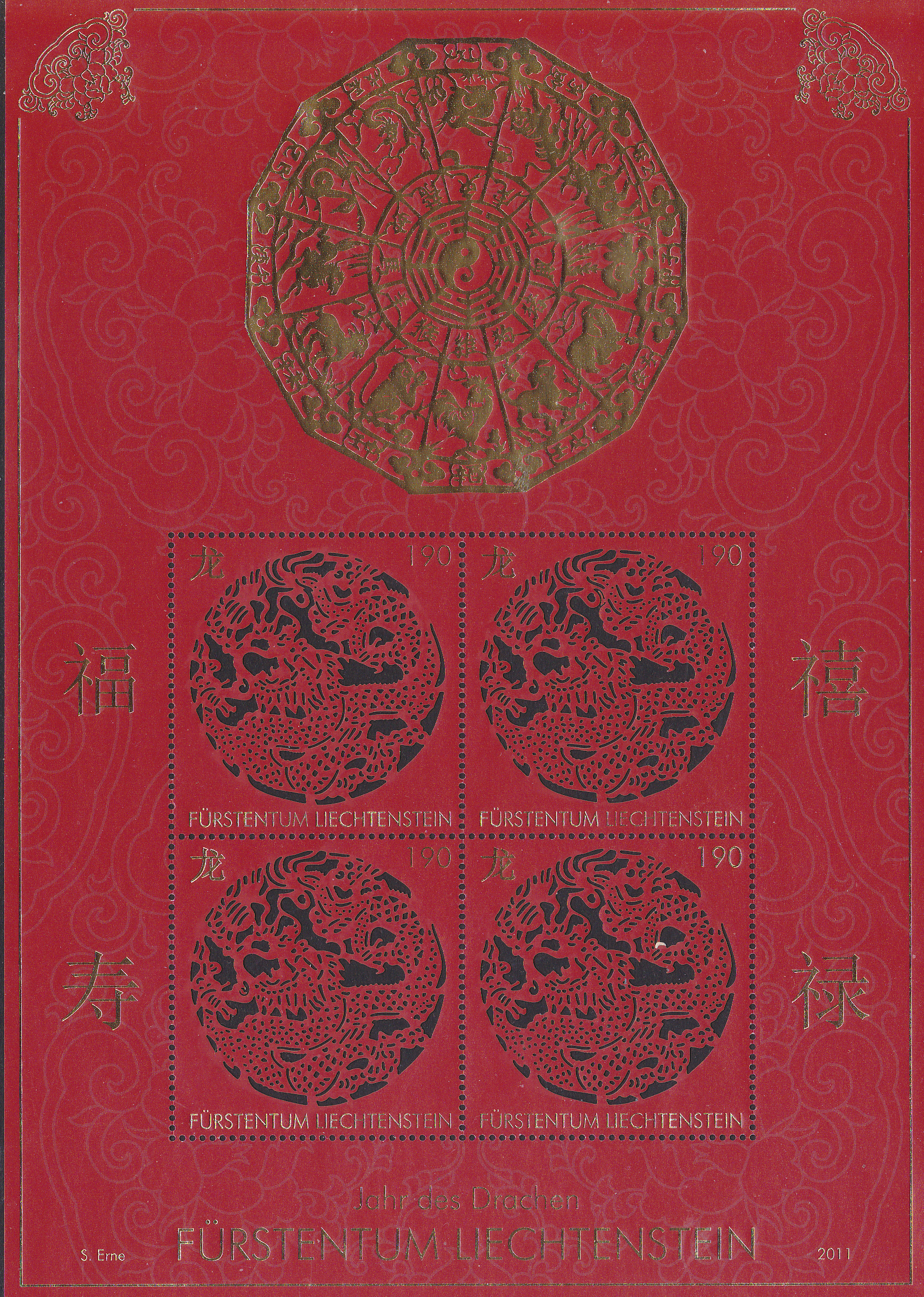 Aus Liechtenstein kommt diese Marke (MiNr 1617) zum Chinesisches Neujahr: Jahr des Drachen mit einem Drachen als Scherenschnitt mit Ausstanzungen im Markenbild.