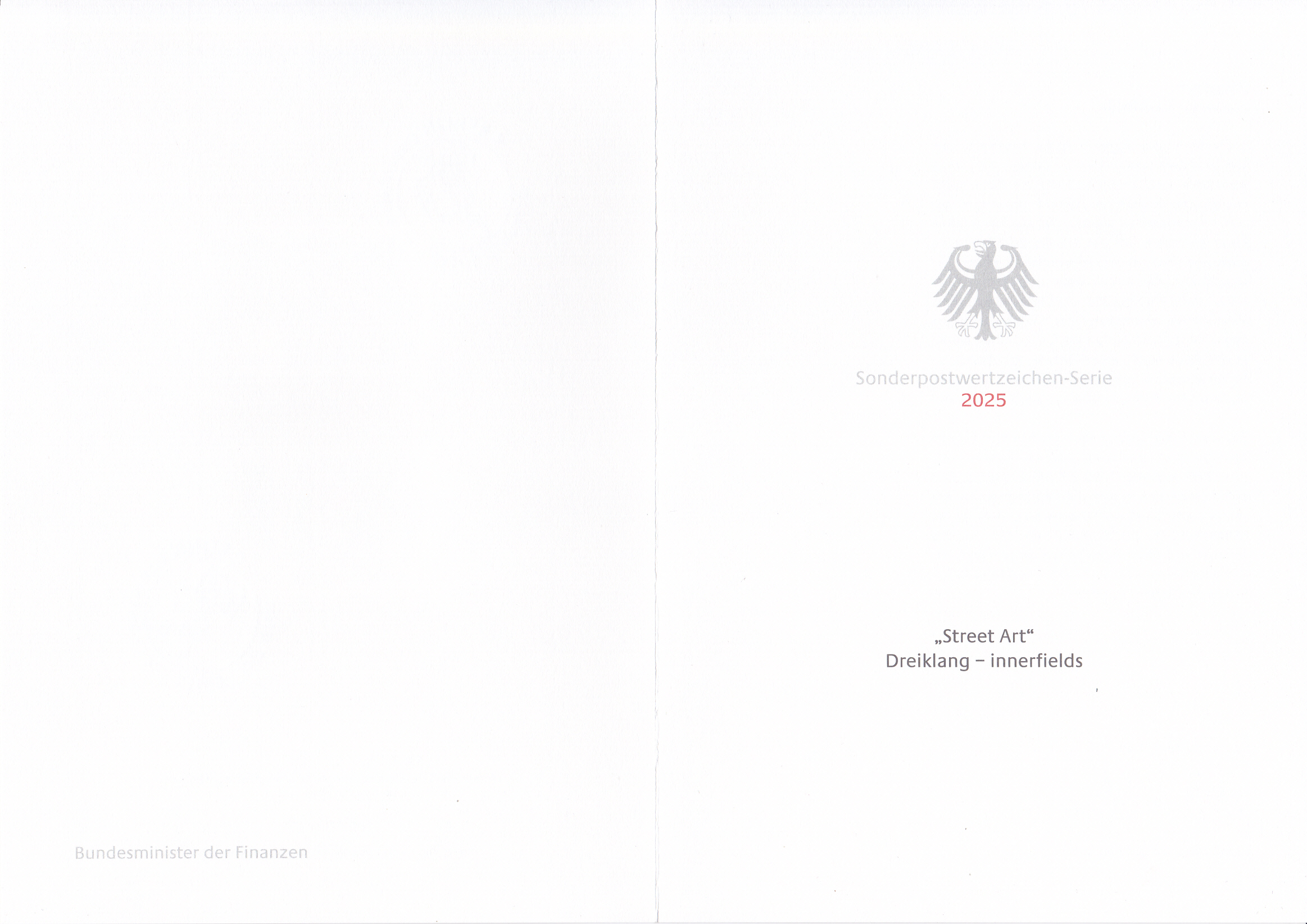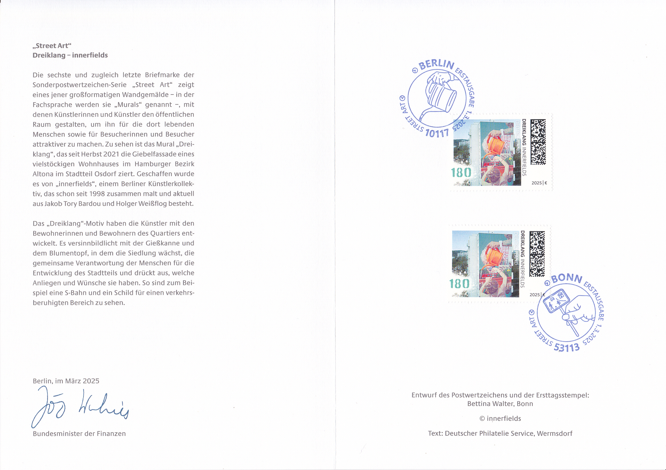 Ministerkarte des Bundesministers für Finanzen mit zwei Marken (MiNr 3893) mit dem Motiv "Wandmalerei 'Dreiklang' von Jakob Tory Bardou (geb.1980) und Holger Weißflog (geb.1979) alias "innerfields", deutsche Graffiti-Künstler, aus der Serie "Street Art " und den beiden Ersttagsonderstempel Bonn und Berlin.