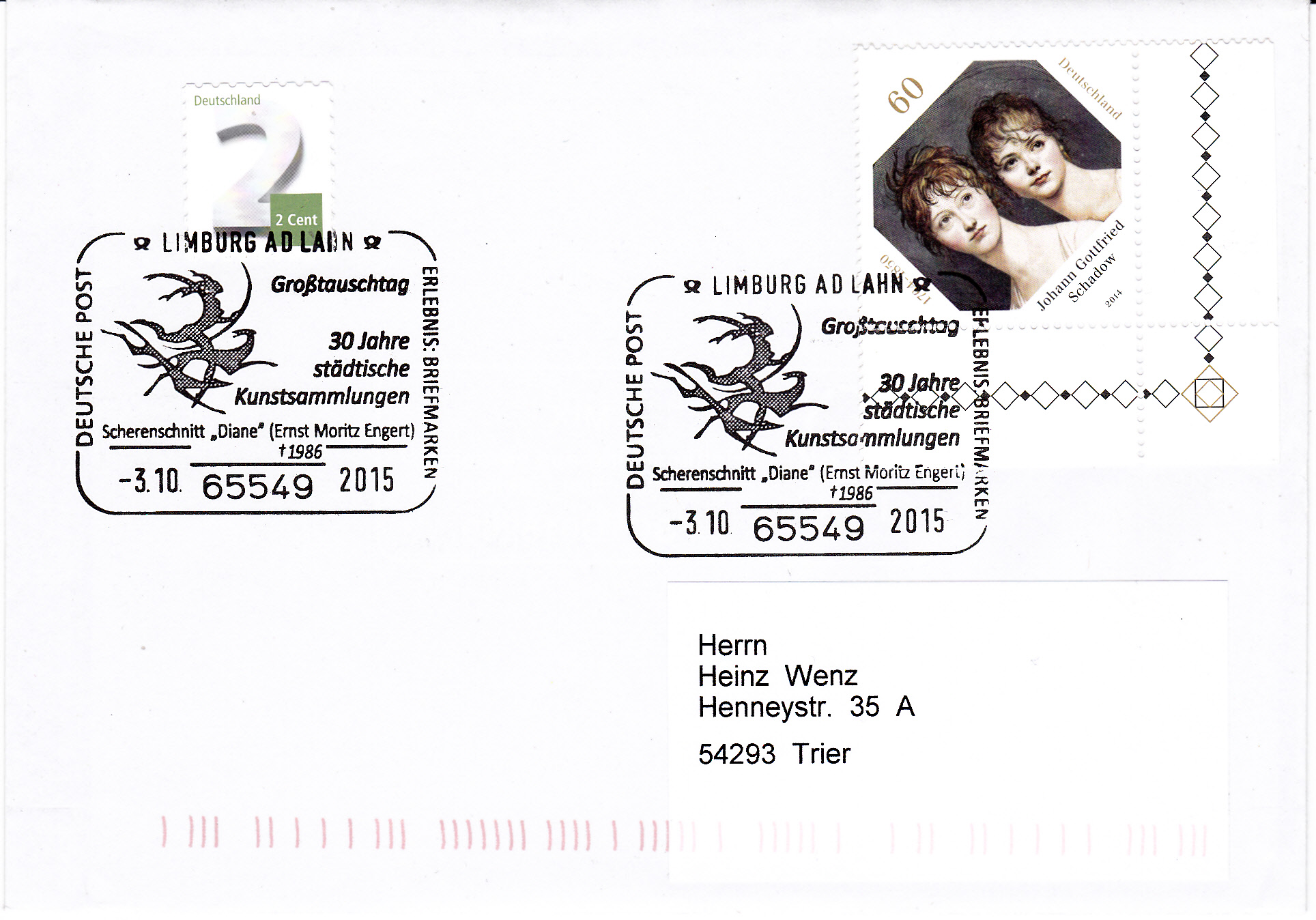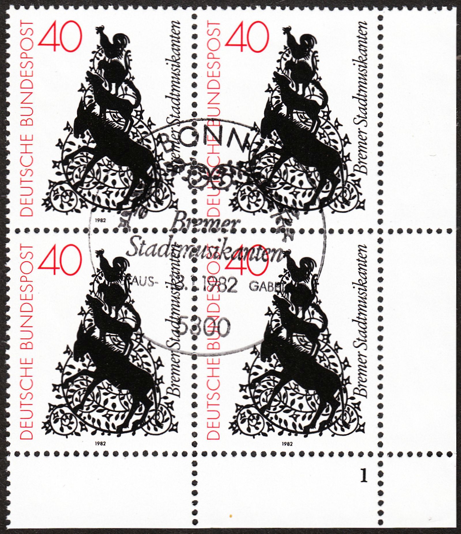 Diese Sondermarke wurde auf Basis des Scherenschnitts "Bremer Stadtmusikanten" entworfen. Hier ein Eckrandviererblock mit Formnummer 1 mit ESST Bonn.: