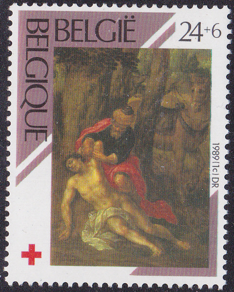 Diese Marke (MiNr 2366) aus einer belgischen Serie zum Jubiläum "125 Jahre Belgisches Rotes Kreuz" zeigt ein Detail aus dem Gemälde "Der barmherzige Samariter" von Denis van Alsloot.