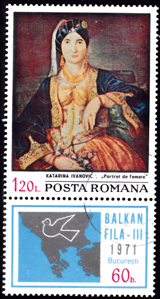 In Rumänien ist zur Briefmarkenausstellung BALKANFILA – III in Bukarest auch eine Marke (MiNr 1934) mit einem Frauenporträt von Katarina Ivanović erschienen. Sie wurde mit fünf weiteren Marken jeweils mit senkrecht anhängendem Zierfeld zusammen in einem Kleinbogen gedruckt. Hier zeige ich die Marke mit Zierfeld.