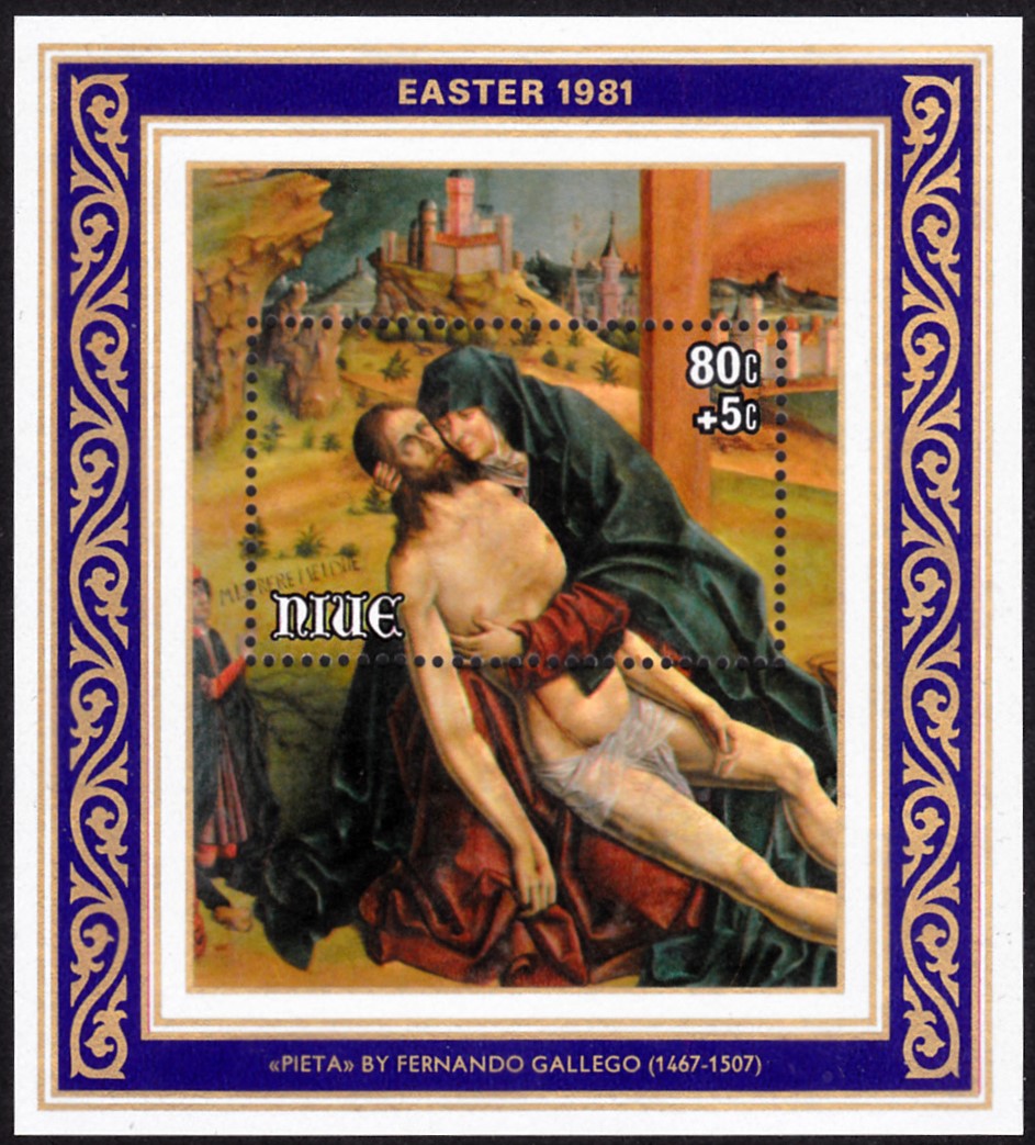 Zu Ostern 1981 ist auf Niue ein Block (MiNr Block 46 mit Marke MiNr 419) mit dem Gemälde "Pieta" von Fernando Gallego erschienen.