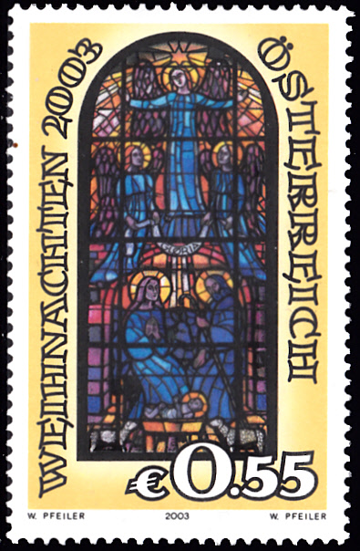 Auf dieser Marke aus Österreich (MiNr 2453) sehen wir sein Werk "Christi Geburt" ein Glasfenster in der Pfarrkirche Hohenems.