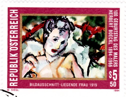 Eine Marke (MiNr 2122) aus Österreich zum 100. Geburtstag von Herbert Boeckl zeigt einen Ausschnitt aus seinem Gemälde "Liegende Frau".