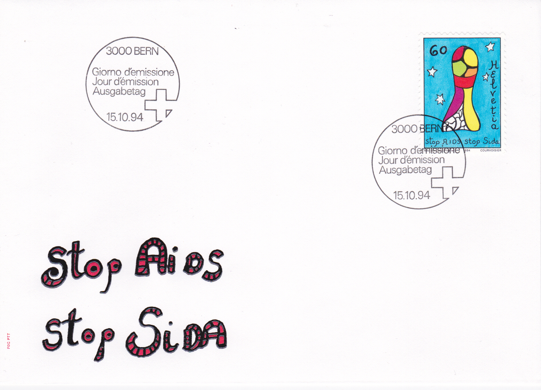 Auf dieser Marke "Aidsbekämpfung" aus der Schweiz (MiNr 1534) ist das Werk "Phallussymbol" von Niki de Saint Phalle abgebildet.