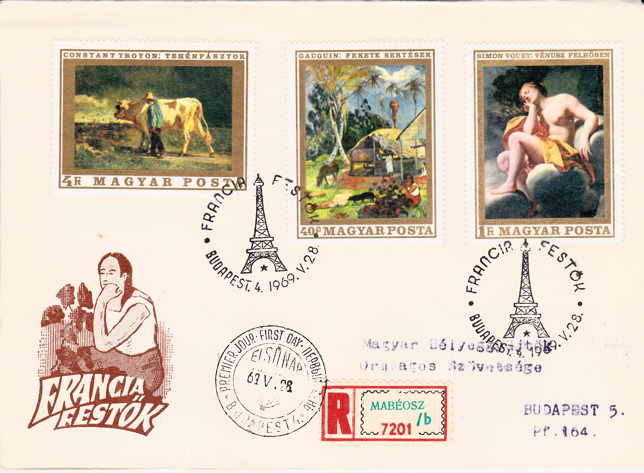 In Ungarn erschien in einer Serie "Gemälde französischer Meister" auch diese Marke (MiNr 2511 A) mit dem Werk "Der Kuhhirte" von Constant Troyon. Die Marke gibt es auch geschnitten.