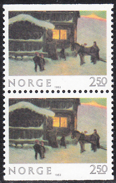 In Norwegen erschien eine Weihnachtsmarke als Heftchenmarke mit seinem Gemälde "Die Gäste kommen". Hier ein Paar aus dem Heftchen (MiNr 895DO/895Du).