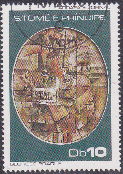 Zur 2. Internationale Briefmarkenmesse in Essen erschien in Sao Tomé und Principe eine Serie mit Gemälden aus dem Folkwang-Museum in Essen. Hier eine Marke (MiNr 519) mit dem Werk "Flasche und Zeitung" von Georges Braque.