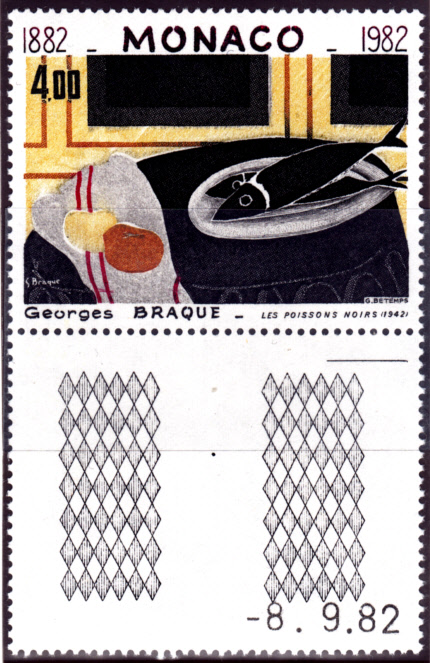 Auf dieser Marke aus Monaco (MiNr 1557) sehen wir "Die schwarzen Fische"; dieses Werk entstand 1942. An der Marke hängt ein Zierfeld vom unteren Bogenrand mit dem Druckdatum.