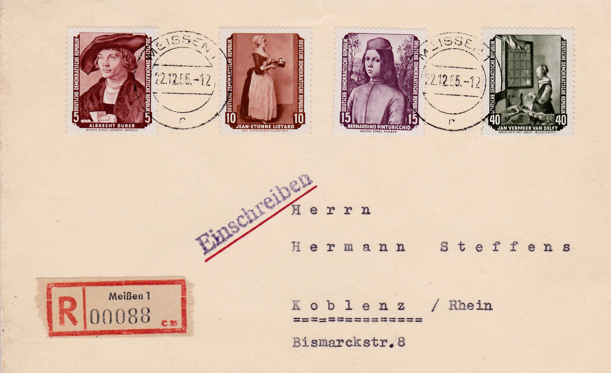 Auf diesem Brief per Einschreiben vom 22.12.1955 von Meißen nach Koblenz wurde diese Marke zu 15Pf mit drei weiteren Marken des Satzes zur portogerechten Frankatur verwendet. Rückseitig wurde in ein Ankunftsstempel vom 24.12.1955 angebracht.