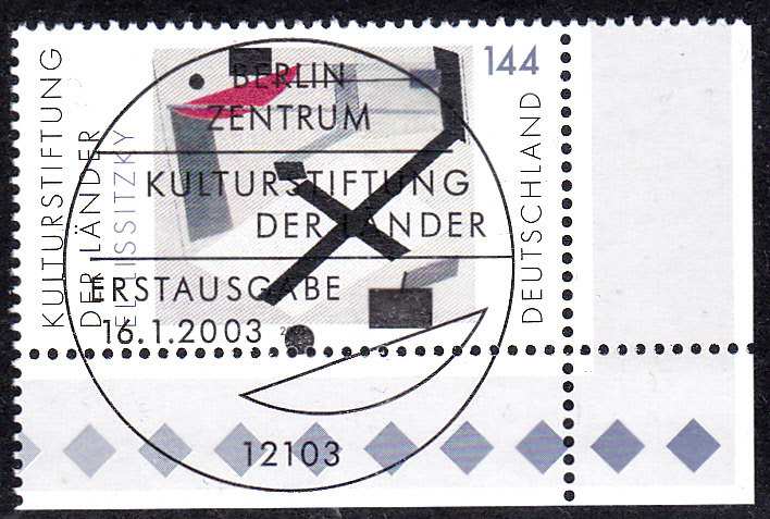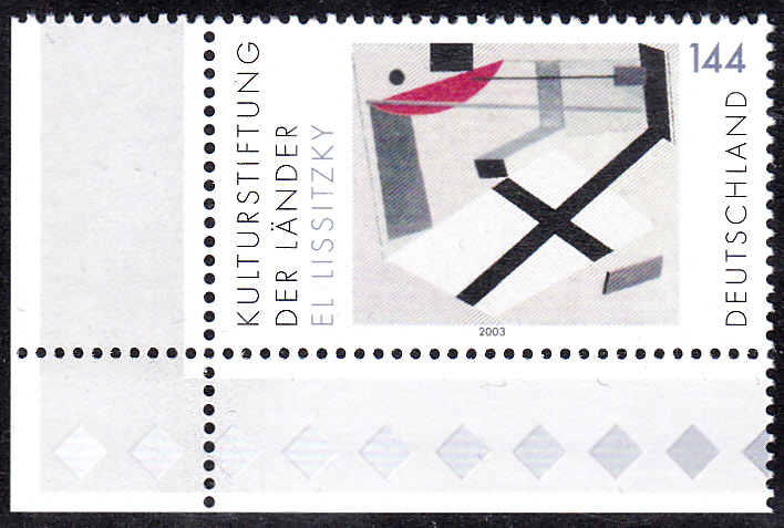Am 16. Jan. 2003 erschien bei der Deutschen Post eine Marke "Kulturstiftung der Länder" (MiNr 2308), die das Gemälde "Proun 30t" von El Lissitzky abbildet. Das 1920 entstandene Werk befindet sich heute im Sprengel-Museum in Hannover. Hier ein Eckrandstück dieser Marke: