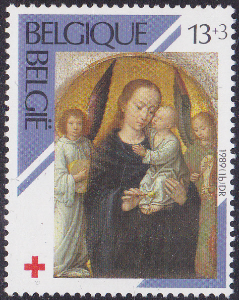 Auf dieser Marke (MiNr 2365) aus einer belgischen Serie zum Jubiläum "125 Jahre Belgisches Rotes Kreuz" wird das Gemälde "Maria mit dem Kinde" von Gérard David gezeigt.
