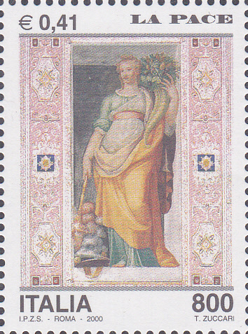 Auf deiner zweiten Marke (MiNr 2719) dieser Ausgabe aus Italien wird "Die Friedfertigkeit" nach einem Fresko von Taddeo Zuccari im Palazzo Farnese in Caprarola gezeigt.