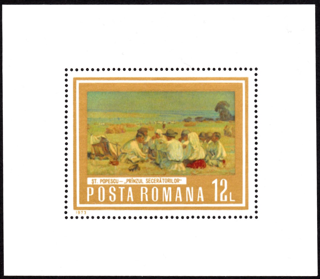 Ștefan Popescu (geb. 20. Jan. 1872 in Buzau, Rumänien) ist ein rumänischer Maler und Skizzenkünstler, Kupferstecher. Die Marke (MiNr 3156) im Block (MiNr Block 109) zeigt das Gemälde "Mittagsmahl der Schnitter" von Ștefan Popescu.