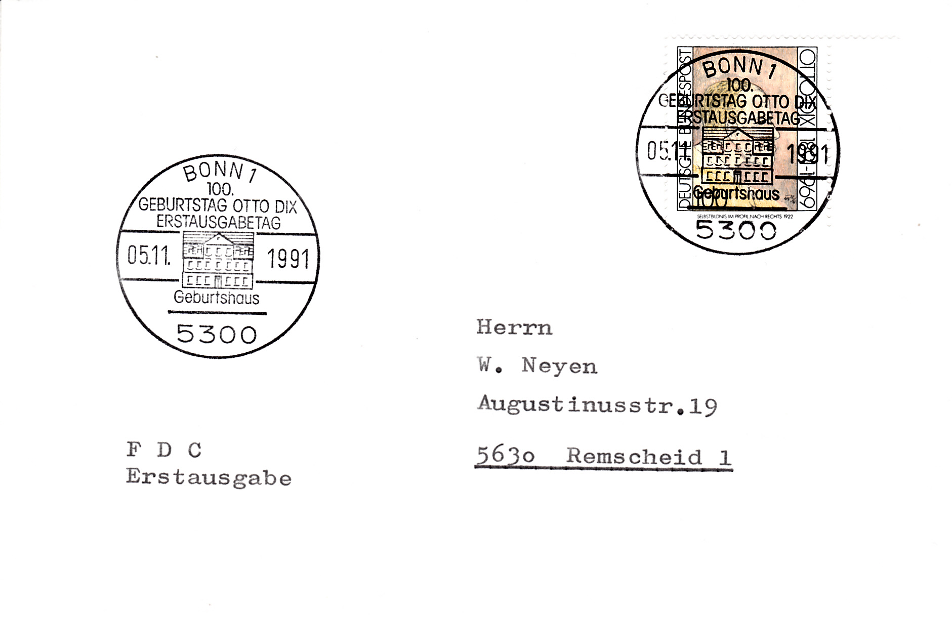 Im Ersttagsonderstempel aus Bonn zur Marken zum 100. Geburtstag von Otto Dix ist sein Geburtshaus abgebildet.