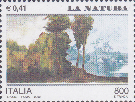 Auf dieser Marke aus Italien (MiNr 2697) werden Motive aus dem Gemälde "Moses und der brennende Dornbusch" von Giorgione gezeigt.