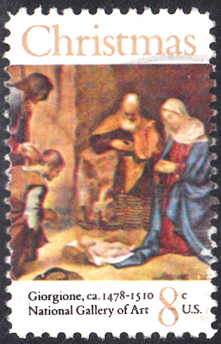 Eine Weihnachtsmarke 1972 aus den USA (MiNr 1057) bildet das Gemälde "Anbetung der Hirten" von Giorgione ab.
