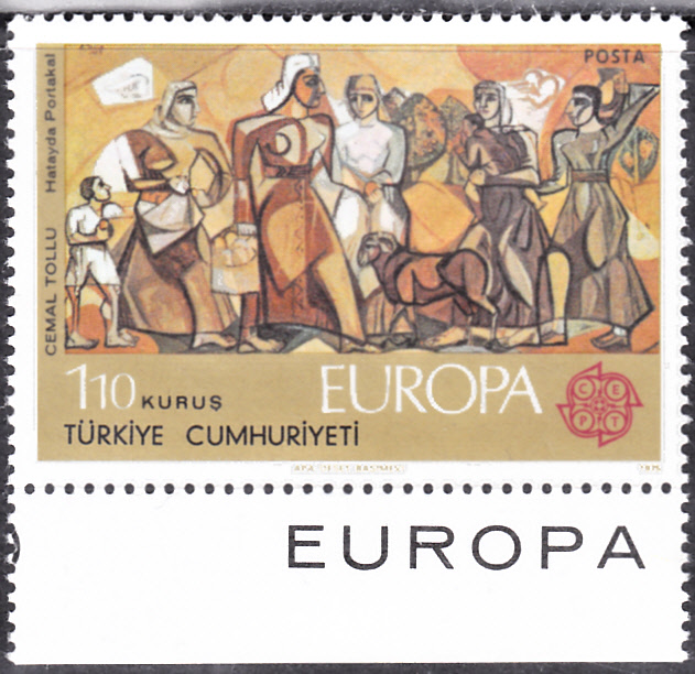 Die Europamarke 1975 zu 110 Kurus aus der Türkei (MiNr 2355) zeigt das Gemälde "Orangenpflückerinnen in Hatay" von Cemal Tollu.