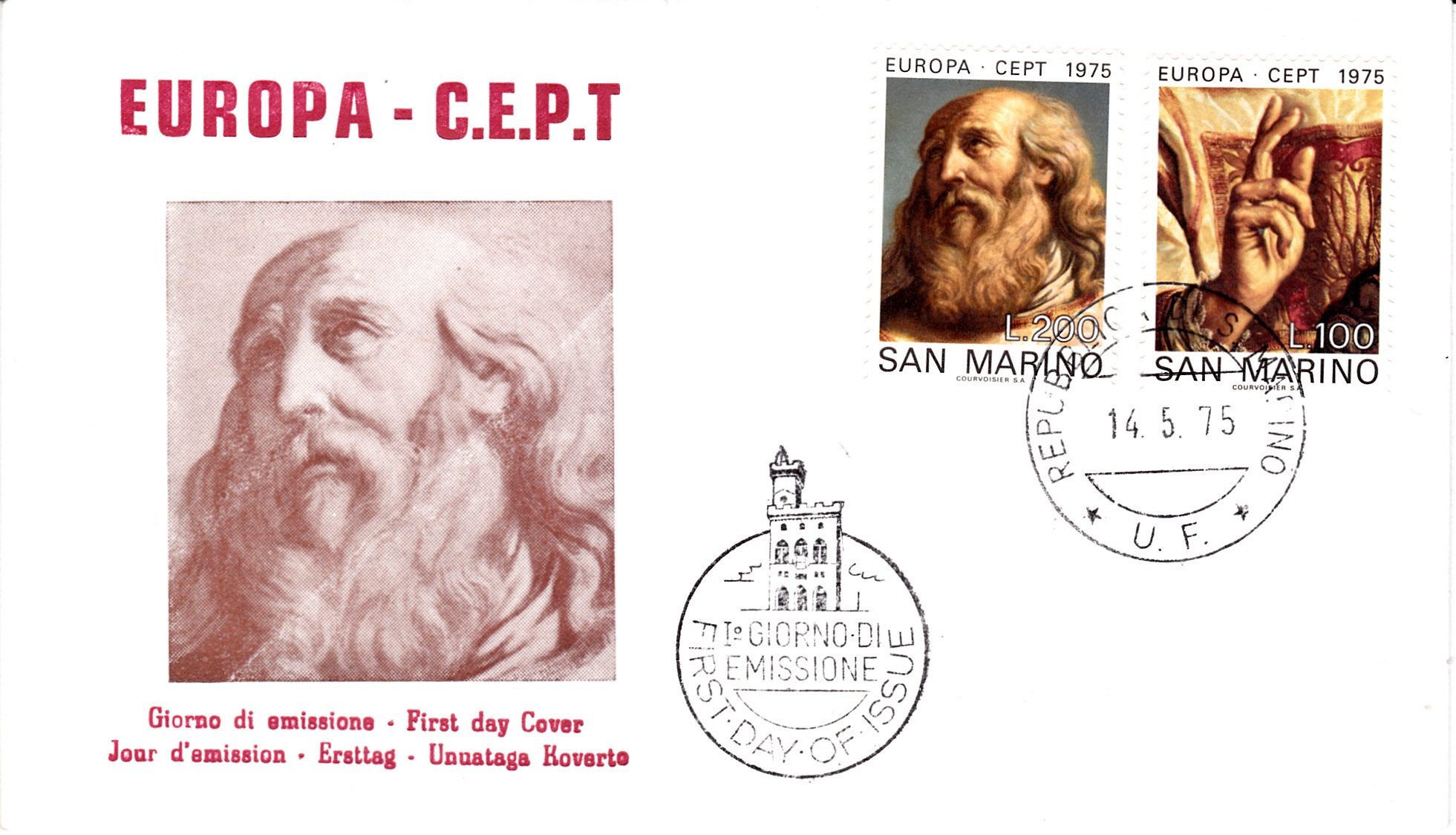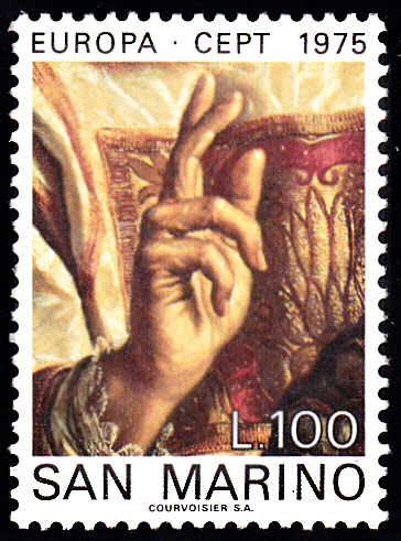 Die Europamarke 1975 zu 100 Lire aus San Marino (MiNr 1088) zeigt das Detail "Segnende Hand des hl. Marinus" aus dem Gemälde "Der hl. Marinus segnet die Stadt San Marino" von Giovanni Francesco Barbieri.