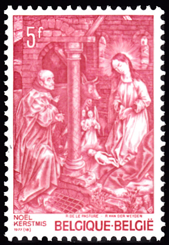 Die Weihnachtsmarke 1975 aus Belgien (MiNr 1836) bildet die "Engelgruppe aus dem Gemälde "Die Anbetung der Drei Weisen" von Rogier van der Weyden ab.
