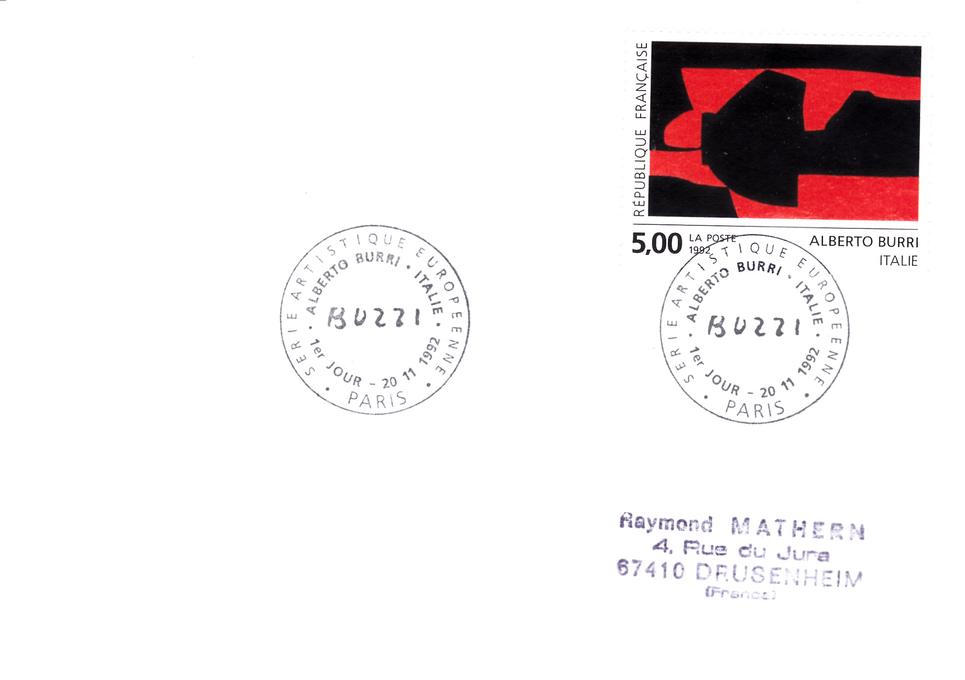 Der Ersttagsonderstempel aus Paris zeigt die Unterschrift von Alberto Burri.
