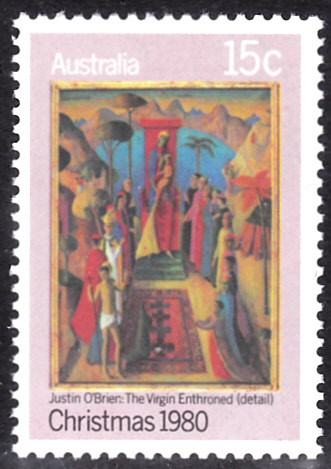Auf einer australischen Weihnachtsmarke aus dem Jahre 1980 sehen wir ein Detail aus dem Gemälde "Jungfrau auf dem Throne" von Justin O’Brien.