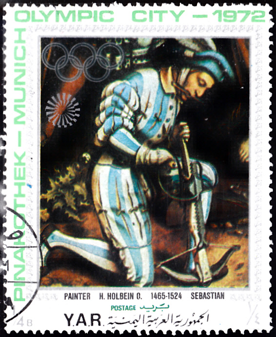 Im Jemen-Nord (Arab. Republik) ist in einer Serie "Olympiastadt München: Gemälde aus der Alten Pinakothek" diese Marke (MiNr 1328) mit einem Detail aus dem Gemälde "Martyrium des hl Sebastian" (Sebastiansaltar).