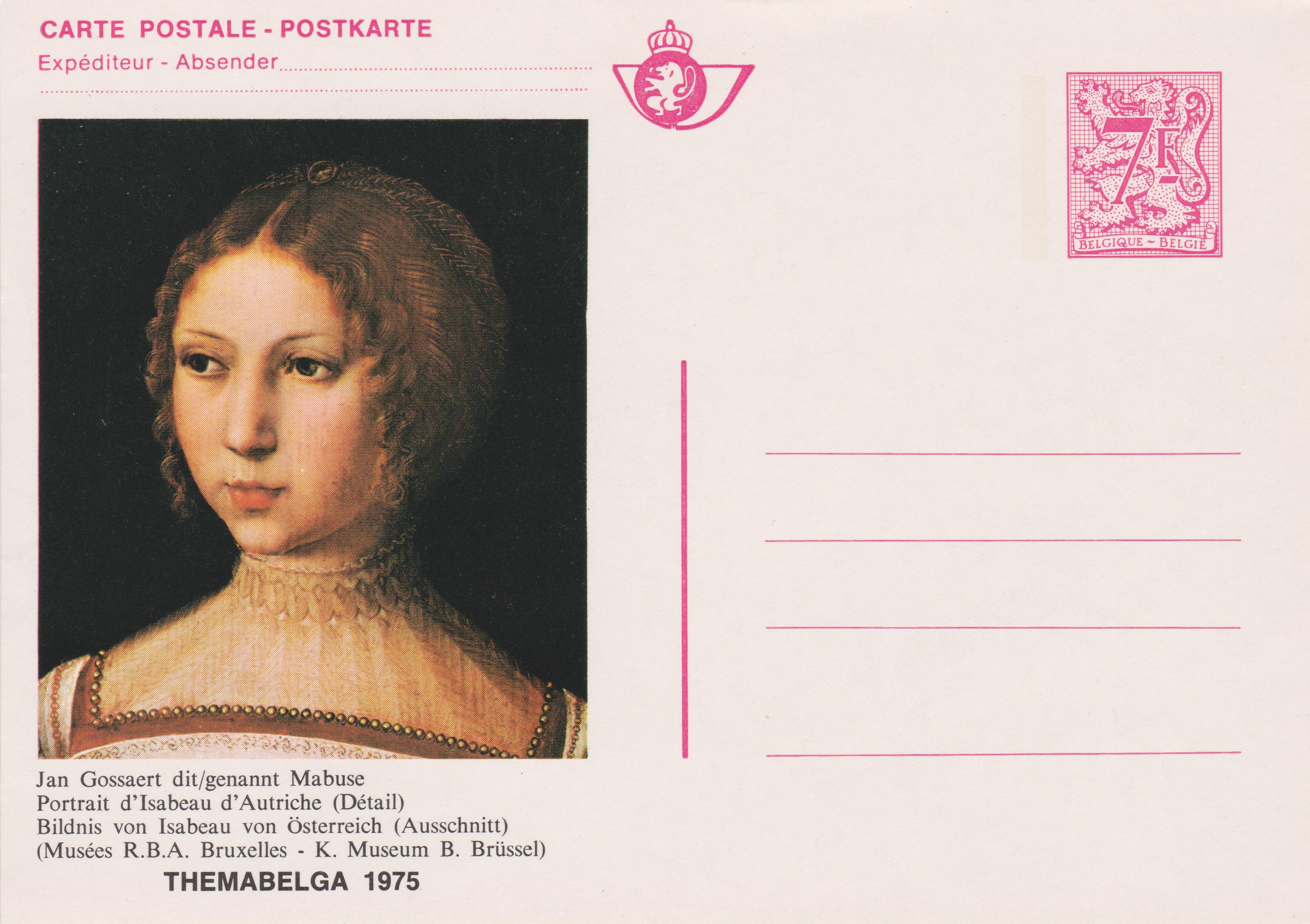 Ganzsache zur Themabelga 1975 mit einem Ausschnitt aus dem Porträt von Isabella von Österreich (1501-1526) von Jan Gossaert. Die Karte wurde mit einem zum Ausgabeanlass der Karten passenden Sonderstempel entwertet und leider nicht verschickt.