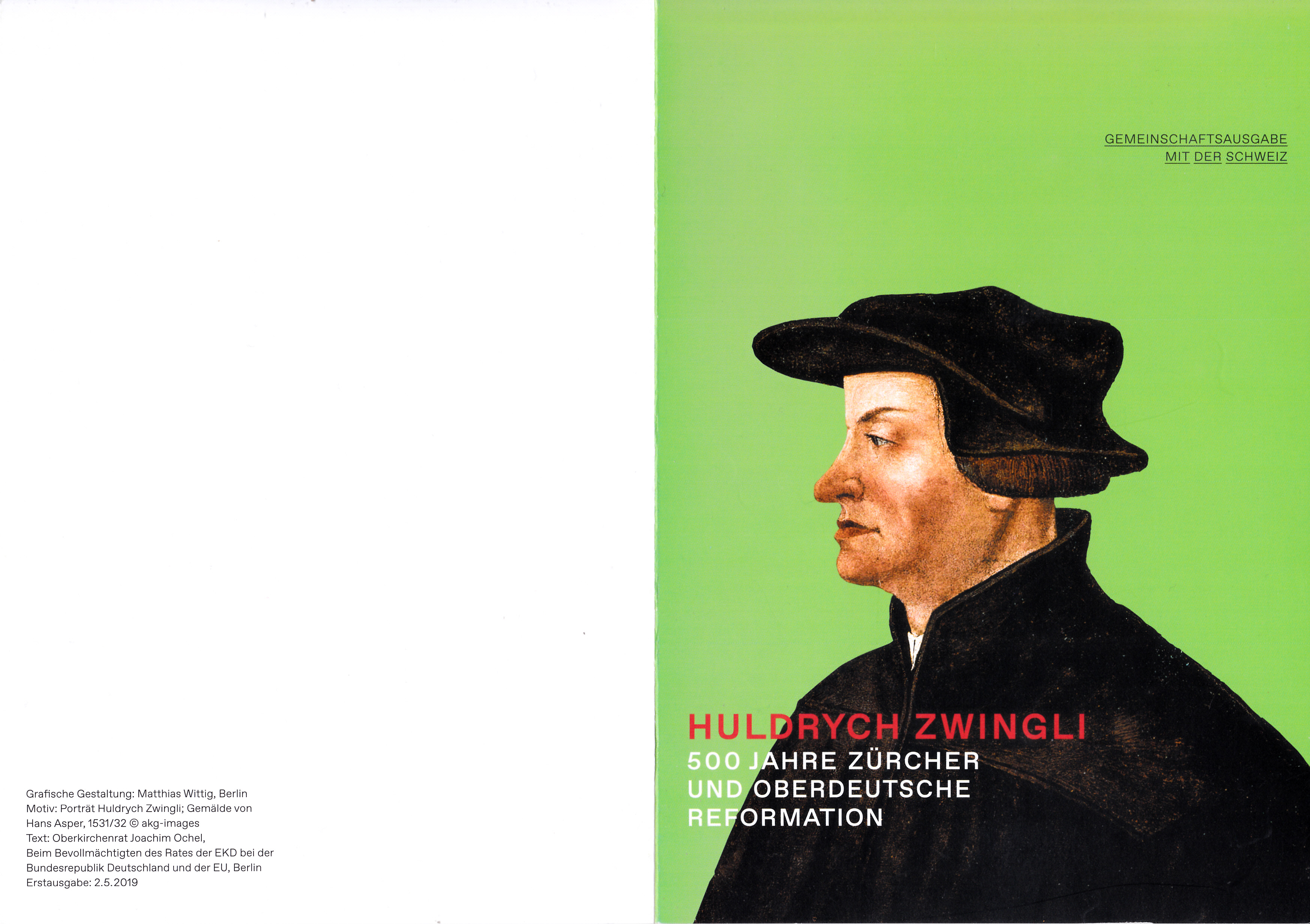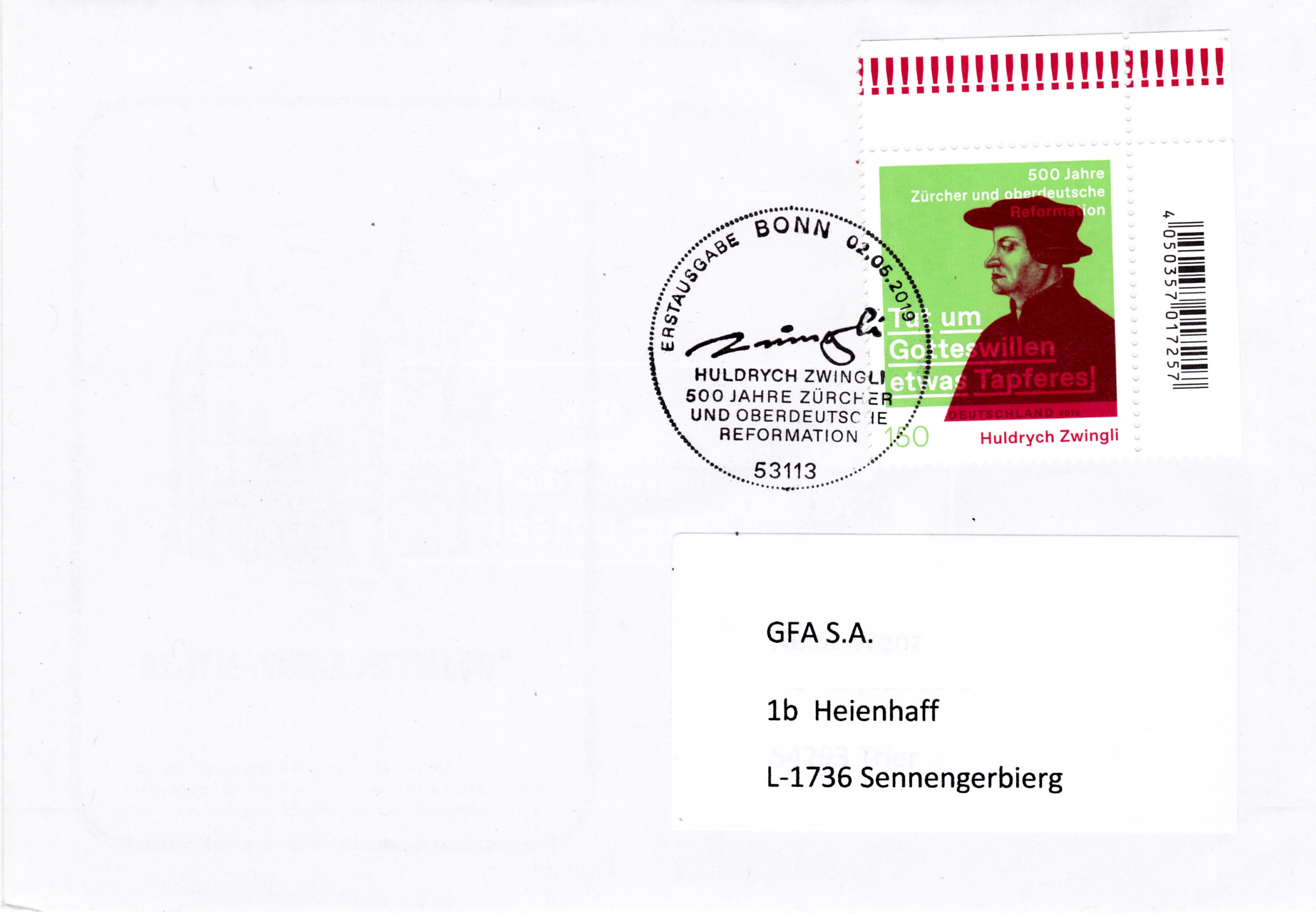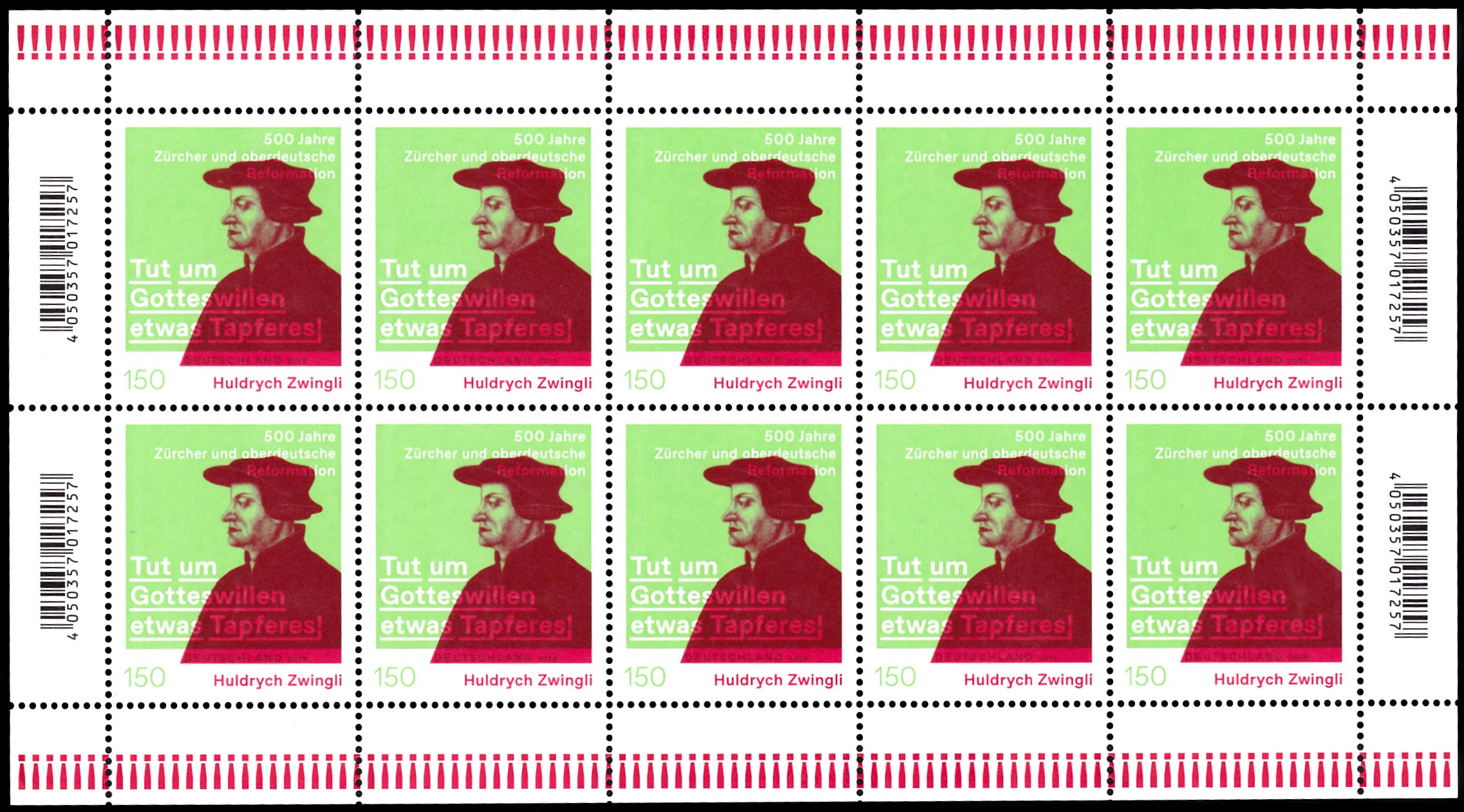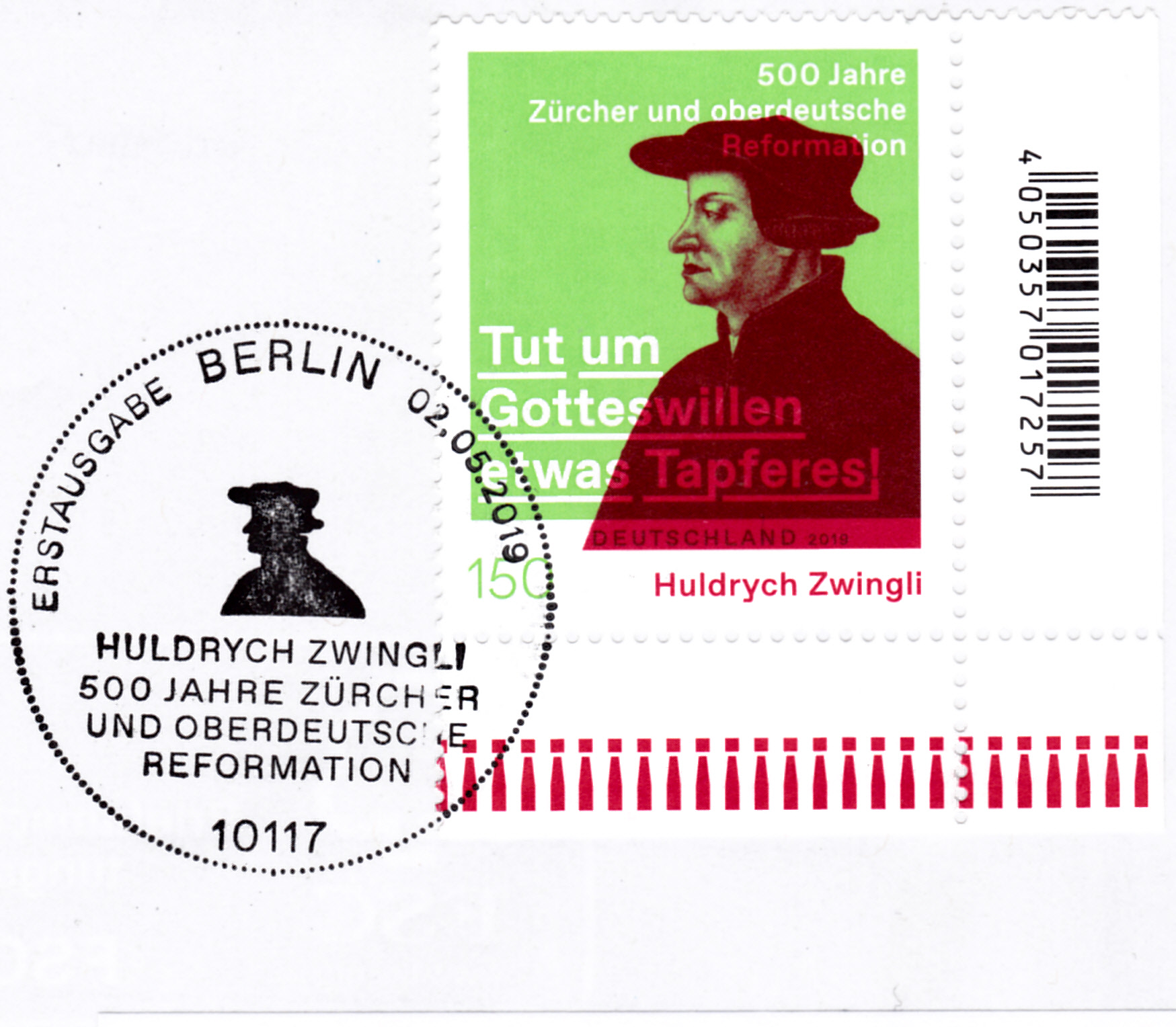 Zum Jubiläum "Huldrych Zwingli – 500 Jahre Zürcher und oberdeutsche Reformation" ist bei der Deutschen Post eine Marke (MiNr 3464) mit einem Porträt von Huldrych Zwingli nach einem Gemälde von Hans Asper (1499-1571)erschienen. Hier zeige ich ein Eckrandstück mit EAN-Codierung.