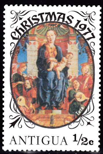 Auf dieser Marke aus Antigua und Barbuda (MiNr 479) ist ein Madinnengemälde von Cosmè Tura abgebildet.