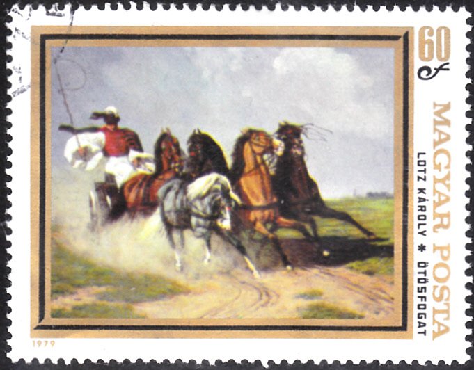 Aus Ungarn kommt diese Marke (MiNr 3363 A) mit dem Gemälde "Fünfspänner" von Károly Lotz.