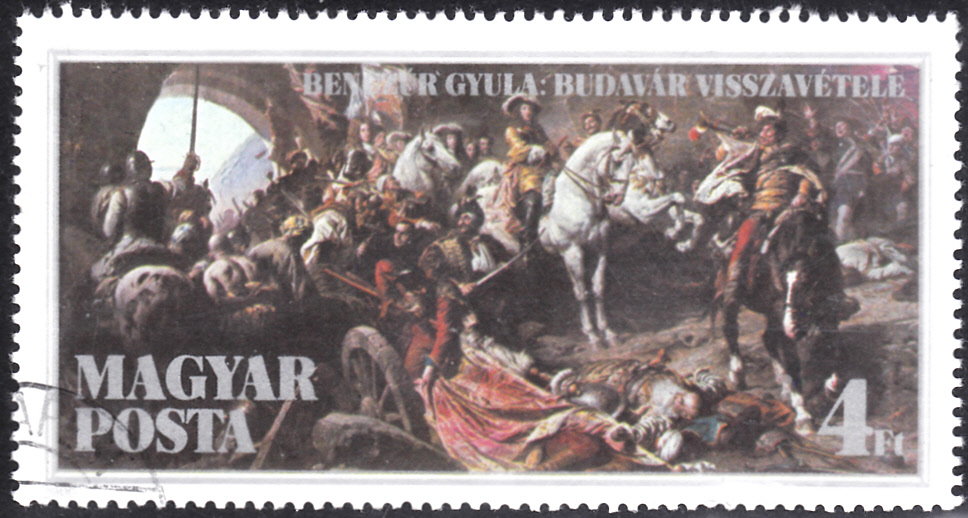 Auf einer Marke aus Ungarn (MiNr 3836 A) zum 300. Jahrestag der Rückeroberung der Burg von Buda ist das Gemälde "Rückeroberung der Burg von Buda" von Gyula Benczúr abgebildet.
