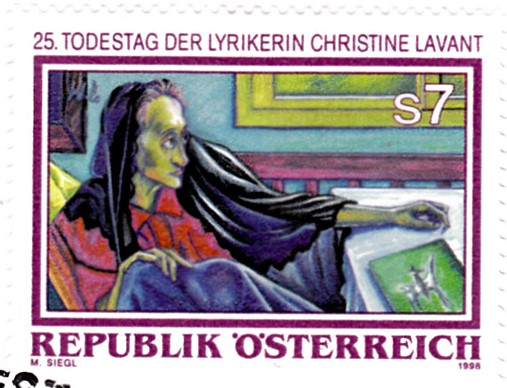 Eine Marke zum 25. Todestag von Christine Lavant aus Österreich eine Marke (MiNr 2256) zeigt ein Porträt von Christine Lavant nach einem Gemälde von Werner Berg.