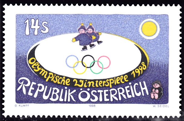 Zu den Olympischen Spiele 1998 in Nagano gab die Österreichische Post diese Marke (MiNr 2243) mit der Abbildung von zwei Eisläufer nach einem Gemälde von Gottfried Kumpf (geb. 28.11.1930) heraus.