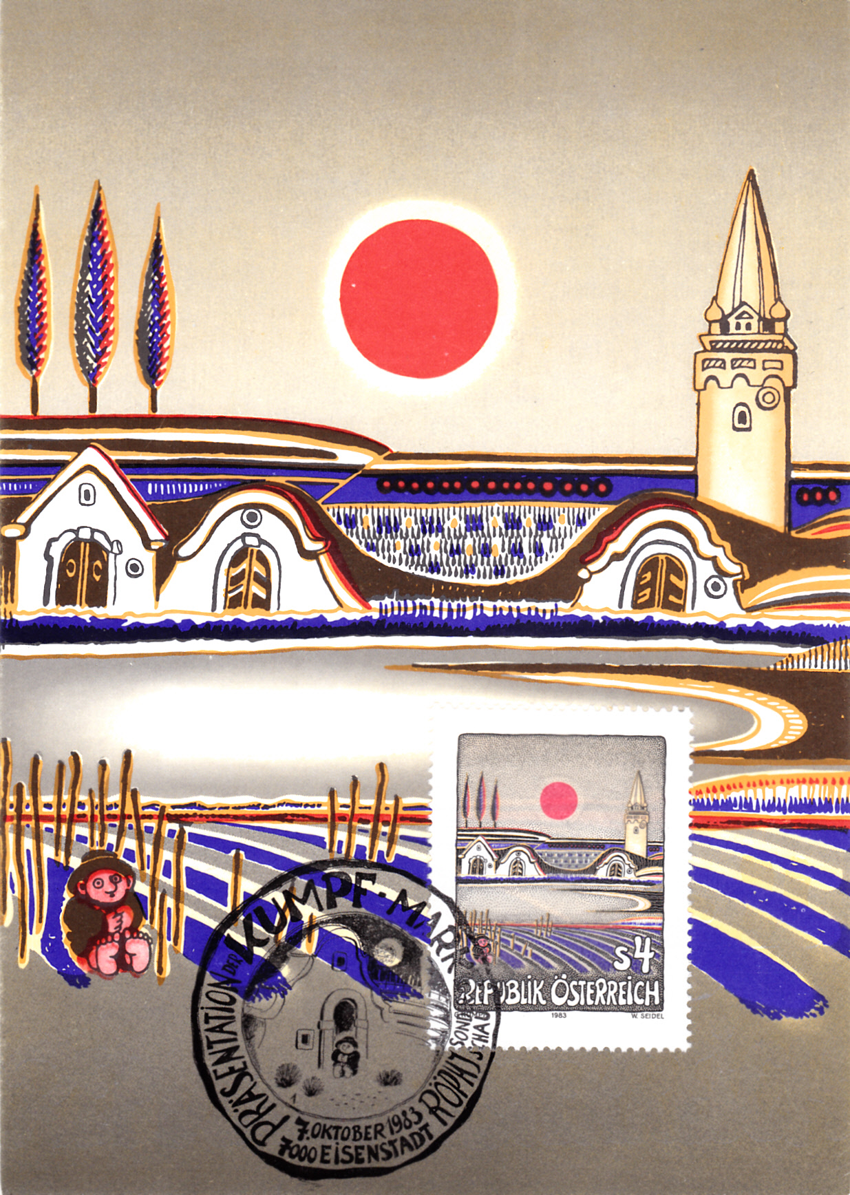 Zur Marke (MiNr 1755) mit dem Gemälde "Abendsonne über dem Burgenland" von Gottfried Kumpf wurde die erste Maximumkarte der Österreichischen Post verausgabt.