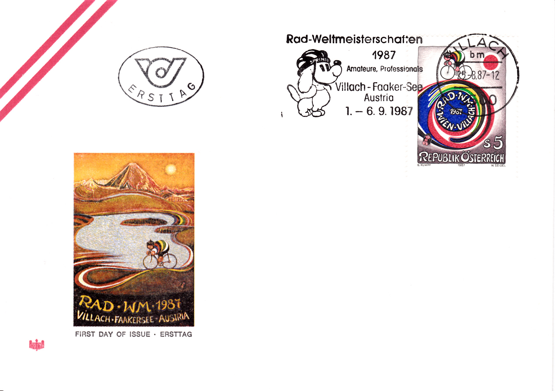FDC mit der Marke zu den Straßen-Weltmeisterschaften 1987 in Villach aus Österreich (MiNr 1897) mit einem Plakat zur WM nach einem Entwurf von Gottfried Kumpf und dem Sonderstempel zum Ersttag aus Villach.