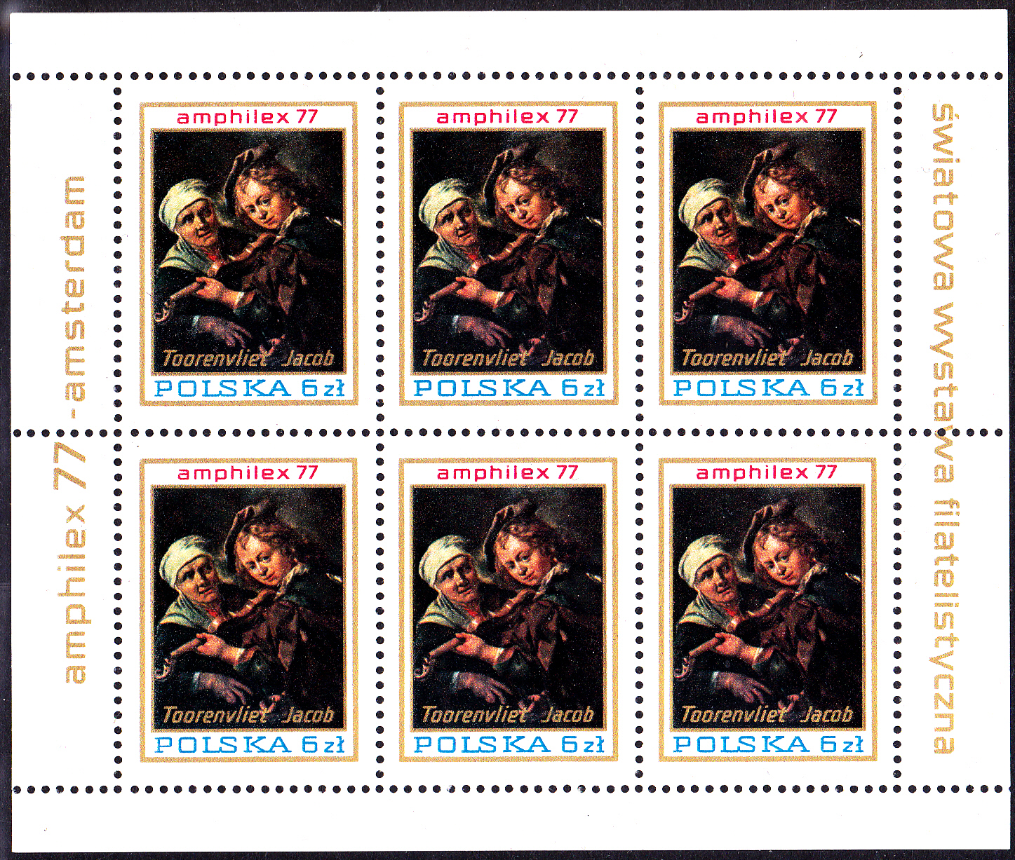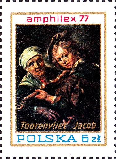 Auf einer Marke aus Polen (MiNr 2508) zur Internationale Briefmarkenausstellung AMPHILEX ’77 in Amsterdam wird das Gemälde "Geigenspieler" von Jacob Toorenvliet gezeigt.