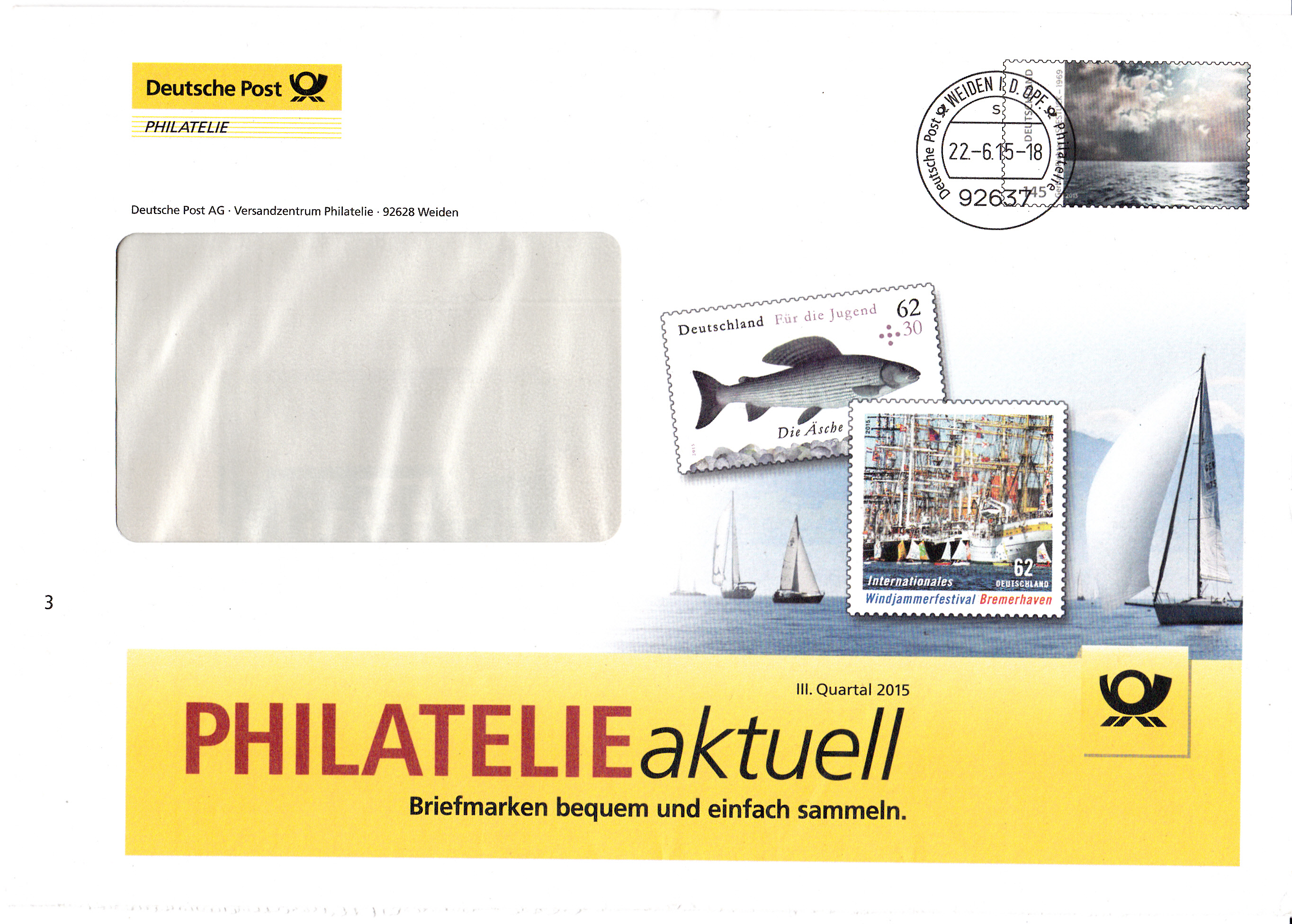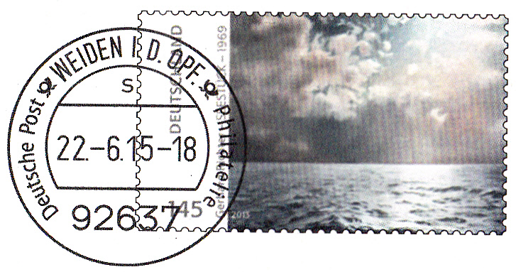 Es folgt ein weiterer Ganzsachenumschlag im Format 229 x 162 mm ebenfalls mit einem Wertstempel mit der Marke zu 145 Cent "Gerhard Richter - Seestück" (MiNr 3020). Die Vorausentwertung hat das Datum "22.-6.15-18". Es ist ebenfalls eine Eigenausgabe der Der Deutschen Post AG - Philatelie Weiden.