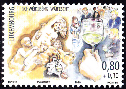 In der Serie Luxemburger Moselregion "Brauchtum" erschien in Luxemburg diese Marke (MiNr 2244) zum Thema "Weinfest in Schwebsingen" mit einer Illustrationen von Pit Wagner.