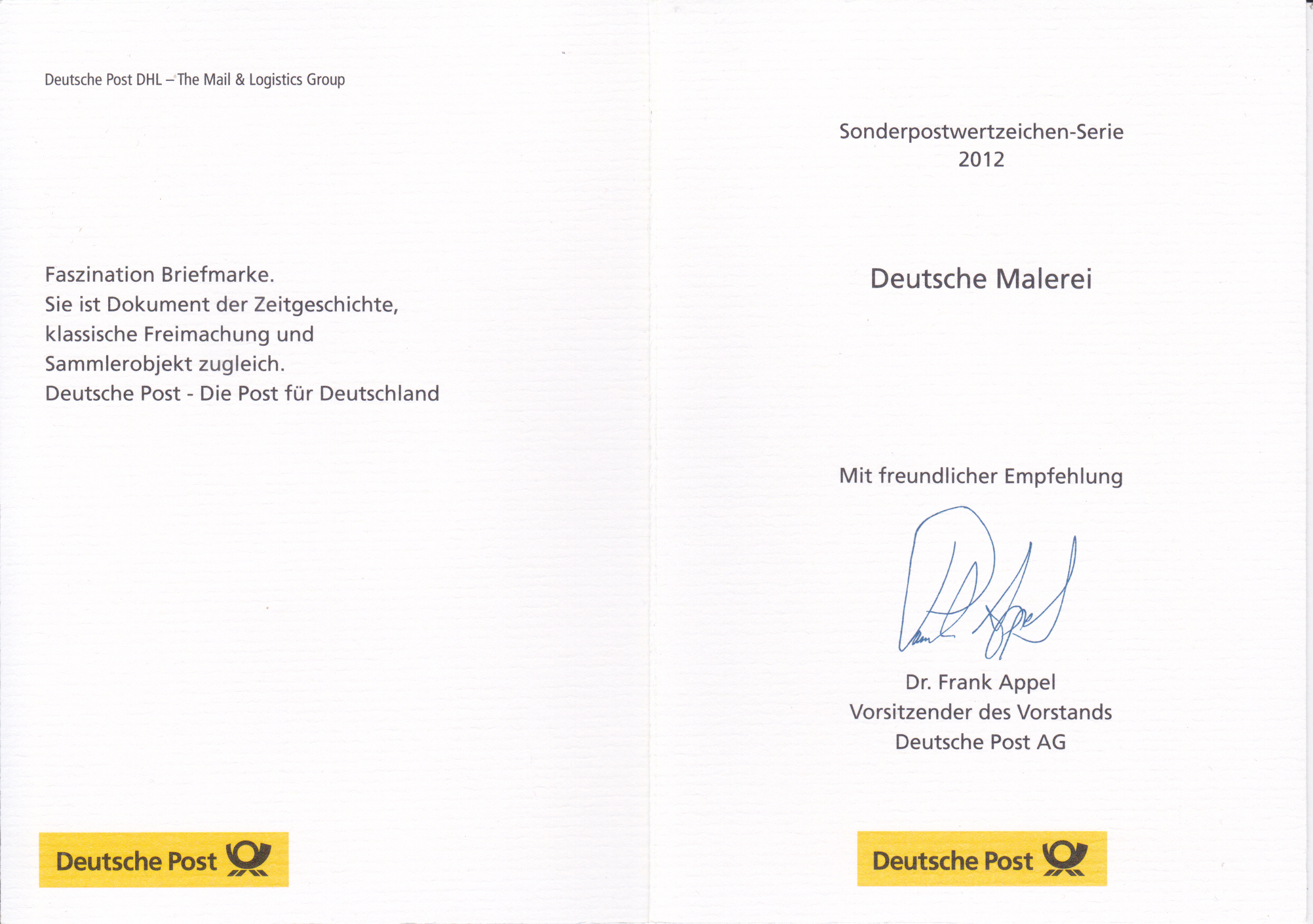 Klappkarte des Vorstandsvorsitzenden der Deutschen Post AG mit der Marke (MiNr 2937) "Das Balkonzimmer" mit dem Gemälde von Adolph Menzel aus der Serie "Deutsche Malerei" und dem Ersttagsonderstempel Bonn.