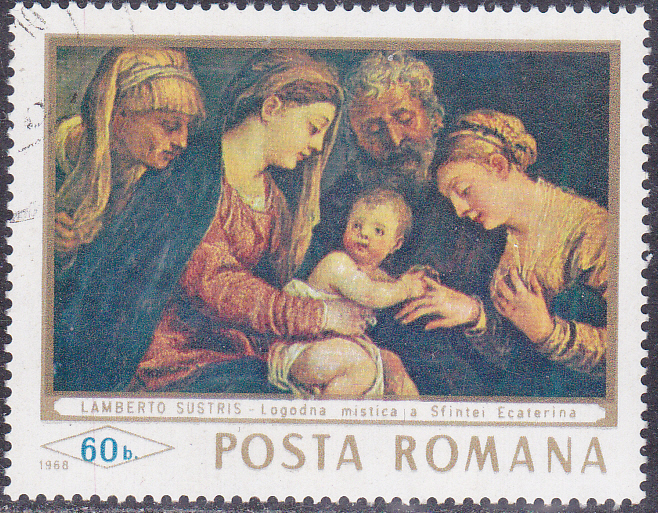 Aus Rumänien kommt eine Marke (MiNr 2709) mit dem Gemälde "Die geheimnisvolle Verlobung der heiligen Katharina" von Lambert Sustris.